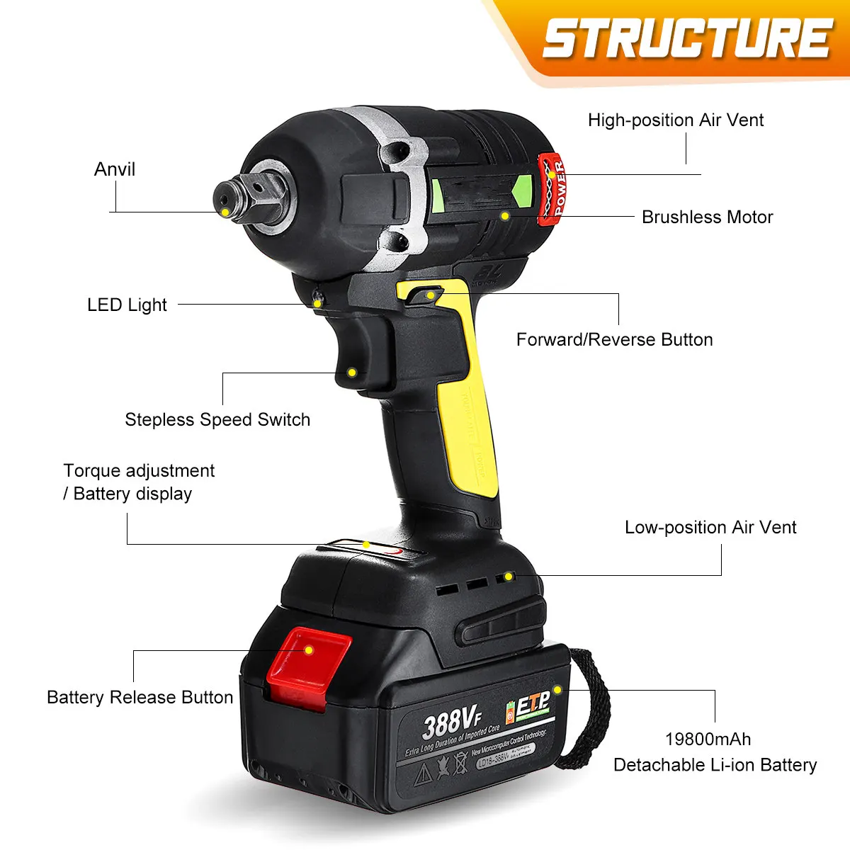 Бесщеточный Электрический ударный гайковерт 388vf 12 нм, 19800 дюйм...