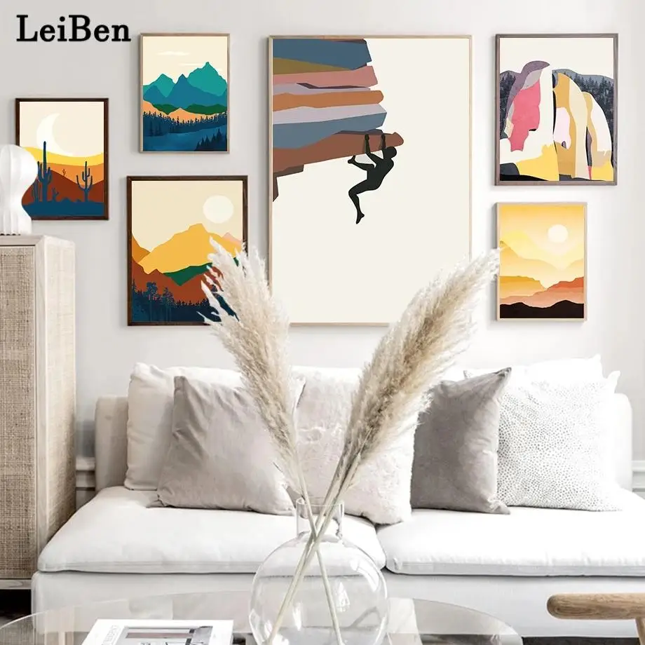 Абстрактная Гора, солнце, луна, скалолазание, иллюстрация, Постер и печать, настенная живопись, холст, картины для декора гостиной
