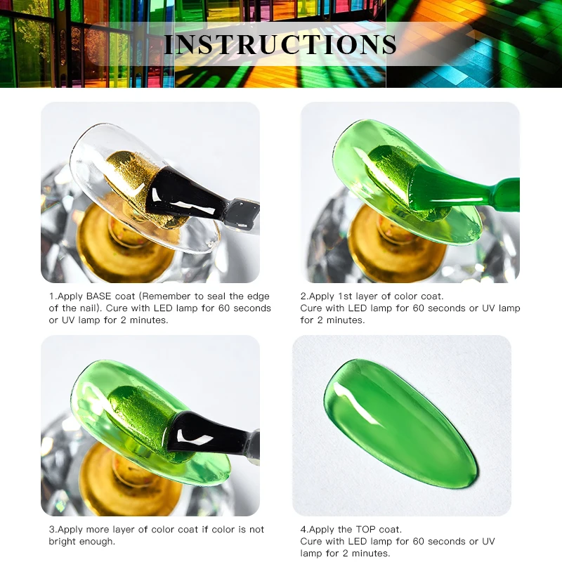 Спецификация:Кол-во: 1 бутылкаОбъем памяти: 8 млКомплектация:1 бутылка радужного Желе Гель-лак для ногтейОсобенности:100% Новинка в розницу и высокое качество.Более быстрая сушка с любым УФ/светодиодным светом.Долговечный и Полупостоянный.Легко наносится и отмачивается.Можно смывать непосредственно водой для удаления геля для ногтей.Подходит для профессионального или домашнего использования.Профессиональный использование:Шаг 1. Очистите ногти, затем обрежьте поверхность ногтей, как обычный процесс маникюра.Шаг 2. Хорошо встряхнуть флакон с лаком, чтобы сбалансировать цвет. (ВАЖНО)Шаг 3. Сначала нанесите Базовое покрытие, которое может сделать Гель-лак длительным дольше, вылечите УФ-лампой или светодиодной лампой. (Необходимо)Шаг 4. Нанесите первый слой цветного гель-лака непосредственно, вылечите УФ-лампой в течение 2 минут или вылечите светодиодной лампой в течение 60 секунд.Шаг 5. Нанесите 2-й слой УФ-геля для ногтей, а затем немедленно вылечите УФ-лампой в течение 2 минут или вылечите светодиодной лампой в течение 60 секунд.Шаг 6. Пальто без протирания верхнее покрытие, вылеченное УФ-лампой или светодиодной лампой.Как удалить УФ-Гель-лак для ногтей:-Замочите ногти в стеклянной миске, заполненной небольшим количеством чистого ацетона, или оберните каждый ноготь ватным диском, смоченным чистым ацетоном, в течение 5-10 минут.-Продукт начнет стать мягким, и вы можете аккуратно отпиливать его или сползать с помощью небольшой деревянной палочки.