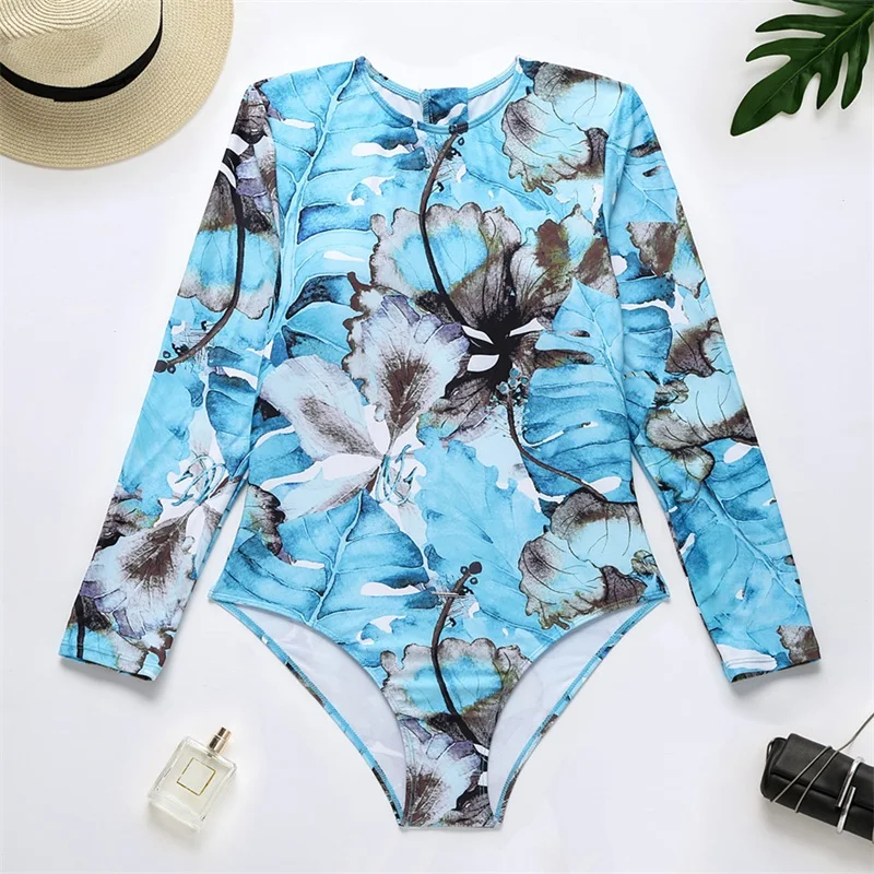 Женский купальник с длинным рукавом, купальник с цветочным принтом, Цельный купальник с защитой от солнца, 2021, женский пляжный костюм на молнии для серфинга и плавания