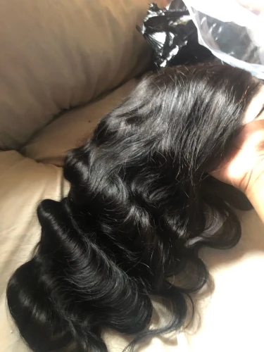 I’ve had this hair installed for 2 weeks and it is flawless. Very minimal shedding and tangling. Can definitely go the whole day without needing a brush. The hair is very very full and soft. The body wave is still there even after washing. The lace melts really good as you see in the picture. The seller’s communication was amazing through out the shipping process