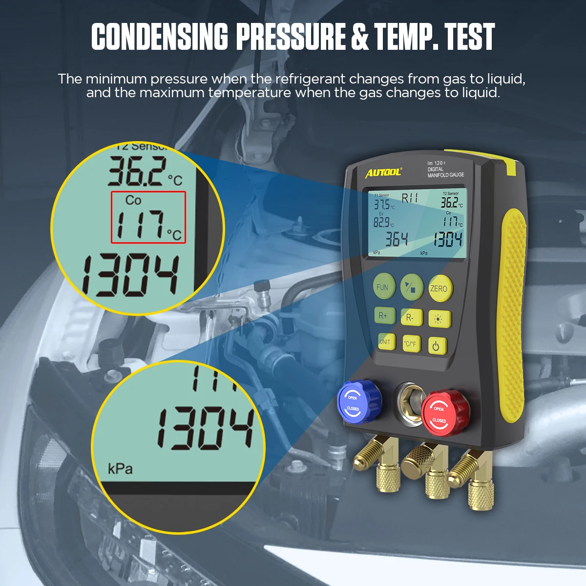 Температура цифрового холодильного коллектора AUTOOL LM120/LM120 + в трубопроводах высокого/низкого давления системы кондиционирования воздуха.