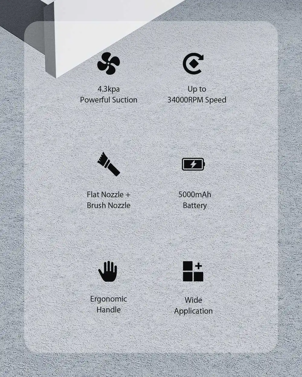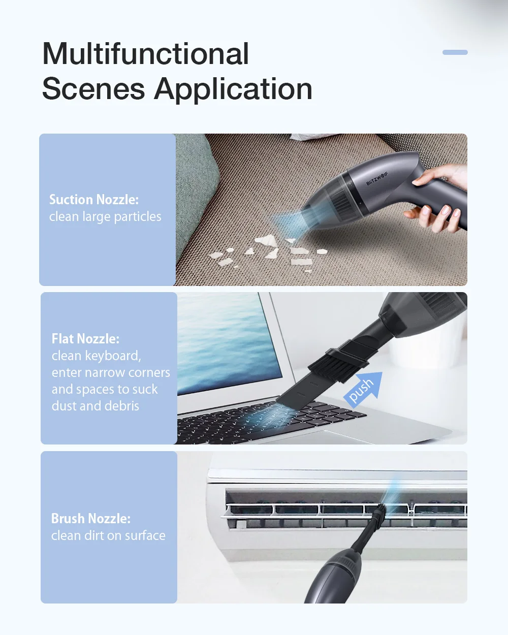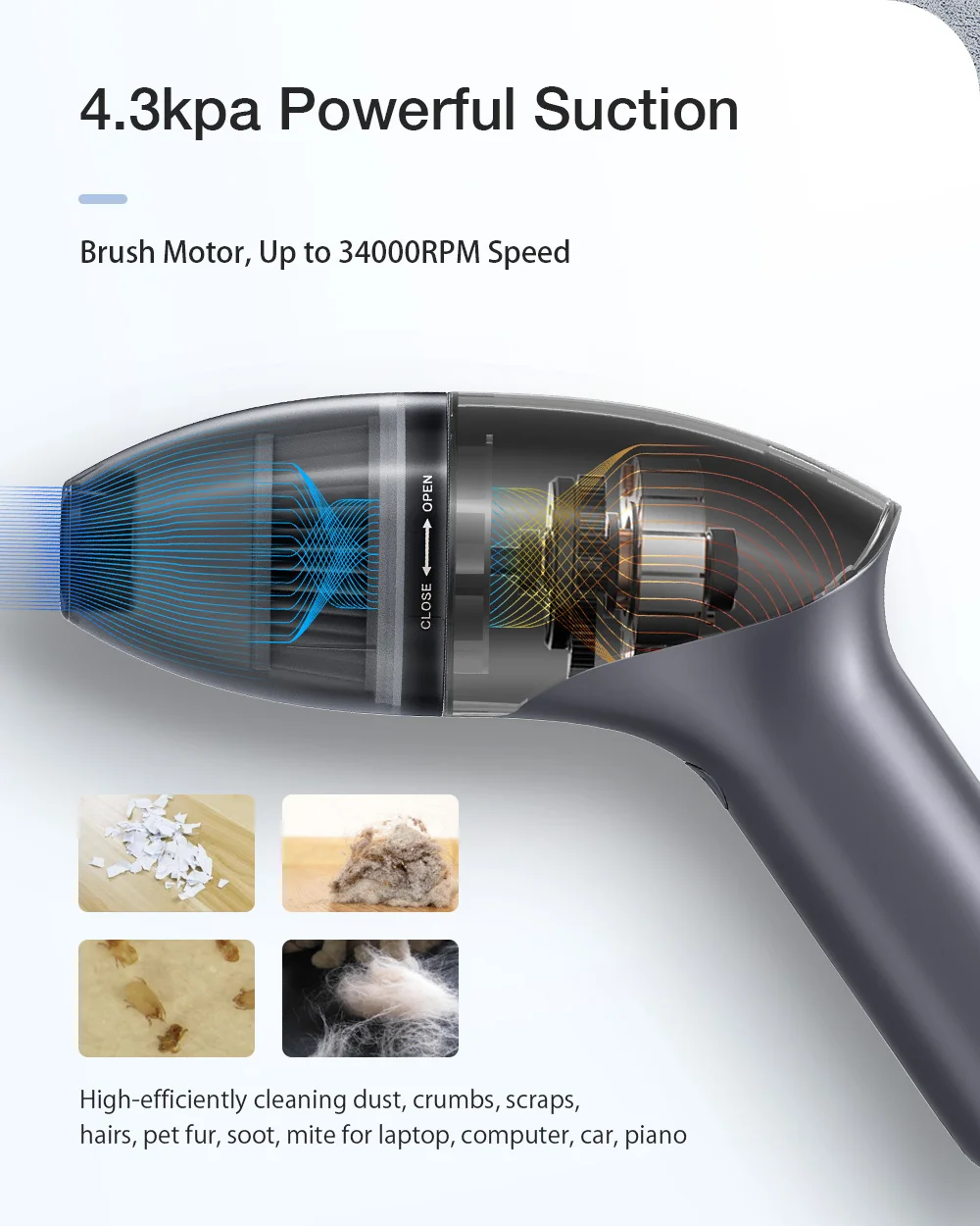 Щеточный мотор, скорость до 34000 об/мин, Высокоэффективная очистка пыли, крошек, обрезков, волосков, меха домашних животных, сажи, клещей для ноутбуков, компьютеров, автомобилей, пианино.