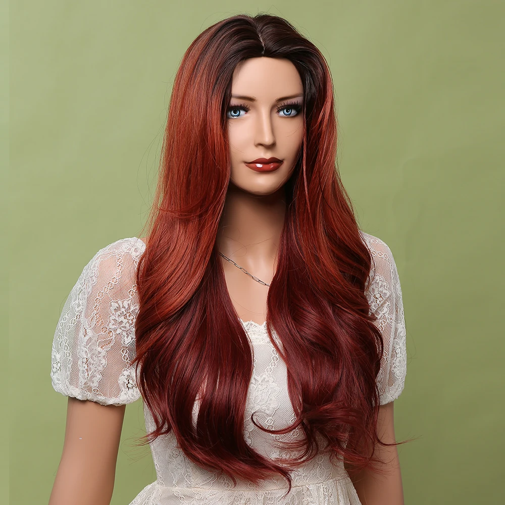 Парики длинные красные волнистые с темными корнями, синтетические в...