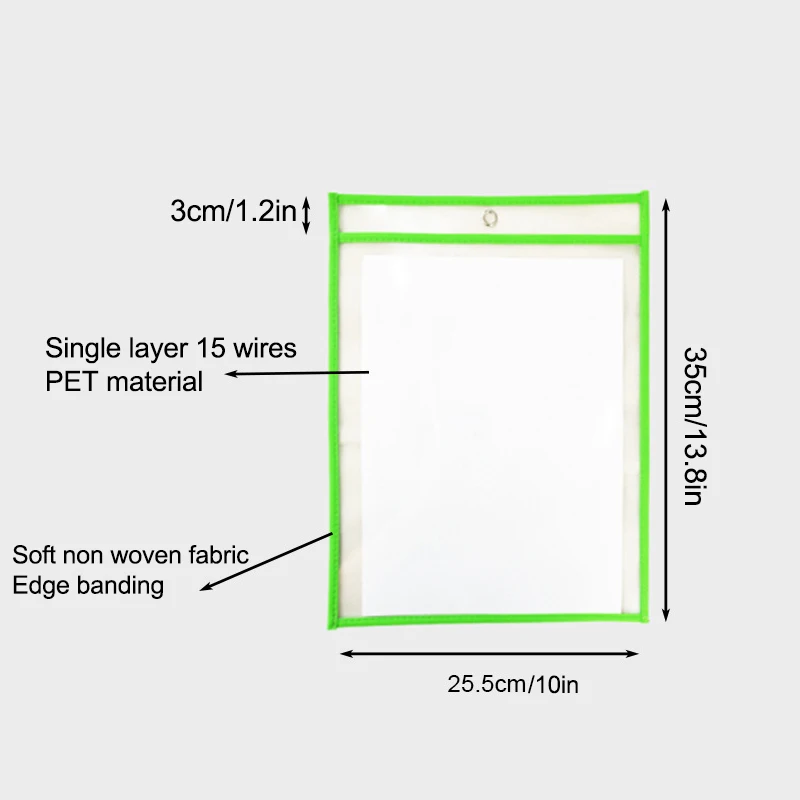 1. Прочный: Он изготовлен из прочного питомца, с двойными стежками на кромке каждой крышки, которая не легко трескается и долговечна.2. Идеальный Размер: большинство стандартных бумаг можно вставить и вынуть, подходит для большинства школьных листов, домашних документов, заказов на работу и т. Д.3. Легко повесить и сортировать: металлический люверс очень подходит для подвешивания. Висячие кольца могут помочь вам Легко сортировать их и повесить их на стену или студенческий стол.4. Чехол для письма и чистки: прозрачный мешок для сухой чистки подходит для односторонних и двухсторонних рабочих столов. Специальная гладкая поверхность легко моется мягкой тканью или бумажным полотенцем.5. Многоразовые: сухие мешки для протирания-это хороший способ для студентов многократно использовать бумажные листы, не теряя бумагу. Экономьте время и деньги. Очень подходит для классных комнат, ресторанов, офисов, художественных центров, домашних школ и т. д.