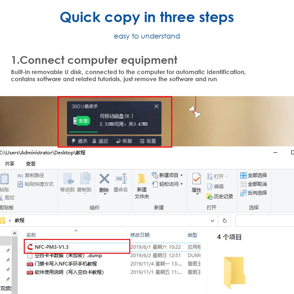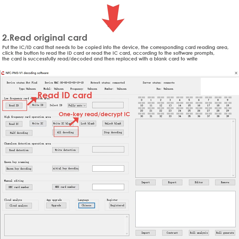 1. Сначала Дешифруйте данные, сохраненные в оригинальной карте; 2. Возьмите оригинальную карту, чтобы провести контроль доступа или лифт; 3. После проветривания, снова Дешифруйте оригинальную карту; 4. Используйте функцию сравнения программного обеспечения, чтобы сравнить, соответствуют ли данные до и после прокрутки карты; Примечание: Если данные из двух частей несовместимы, пожалуйста, свяжитесь со службой поддержки клиентов. Если они последовательны, они могут быть скопированы напрямую.