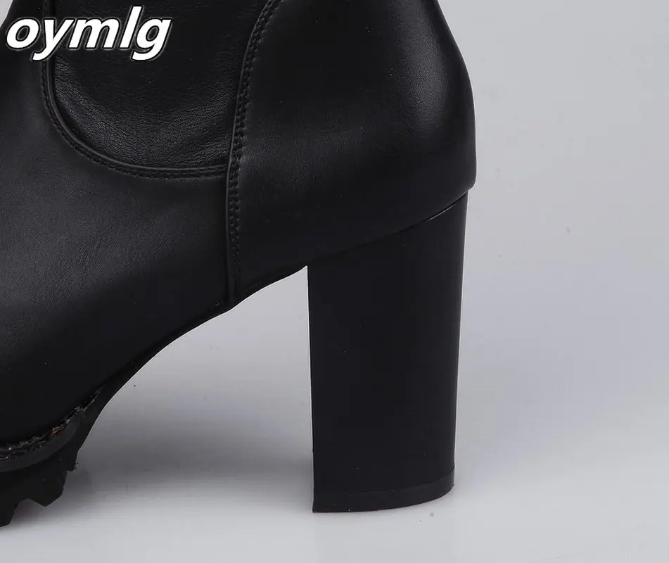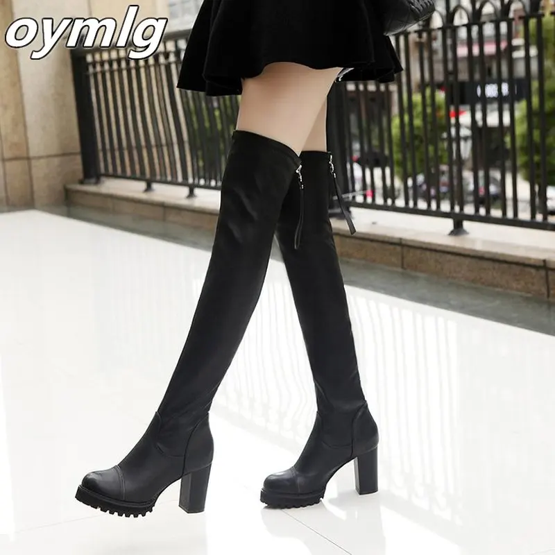 Ботфорты женские кожаные на платформе, высокие сапоги на блочном каблуке, привлекательные ботфорты, Осень-зима