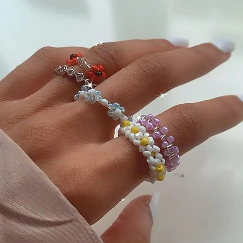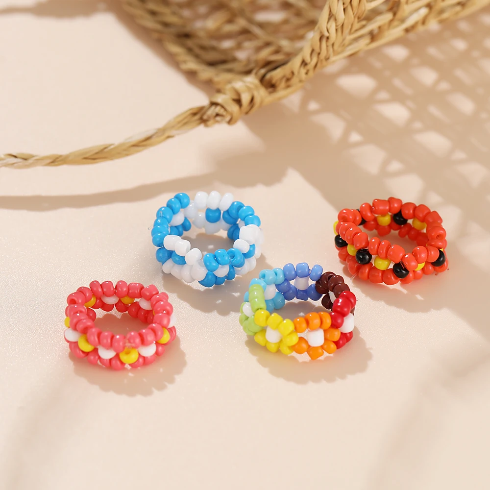 Богемные разноцветные резиновые кольца с маргариткой и бусинами для...