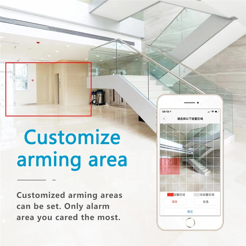 【Arming】 вы можете настроить будильник устройства. Вы можете выбрать определенное время и область тревоги, убедитесь, что каждая область защищена. Поддержка удаленного запуска сигнализации и записи в tf-карте можно просматривать удаленно в любое время.