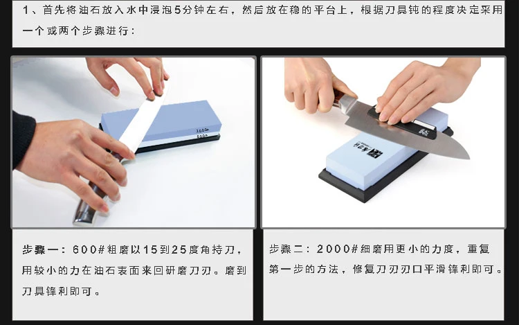 1. При использовании поместите точилку для ножей на стабильную поверхность. 2. В соответствии с тупым ножом выполните следующие действия: Шаг первый: Грубое шлифование для тупого ножа Поместите нож в алмазный шлифовальный слот, держите нож в середине слота и слегка Вытяните нож вдоль лезвия от кончика до пятки. Один раз в шесть месяцев или по требованию. Шаг 2: средняя шлифовка для обслуживания ножей. Пожалуйста, обратитесь к первому шагу по использованию метода. Шаг 3: мелкое шлифование. Всегда заканчивайте этим шагом, чтобы лезвие было гладким и ярким. Пожалуйста, обратитесь к первому шагу по использованию метода. 3. Очистите нож водой или стеклоочистителем и высушите его после использования; Очистите точилку ножа неабразивной щеткой.