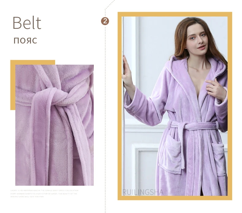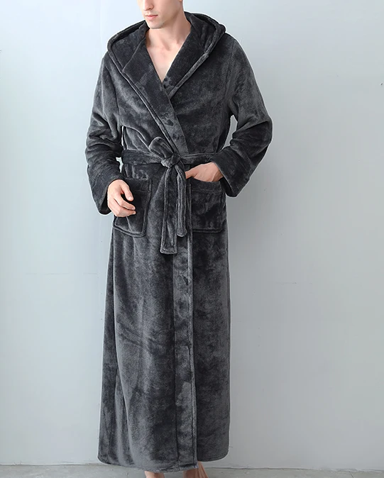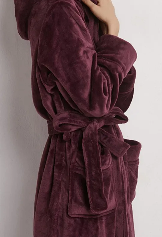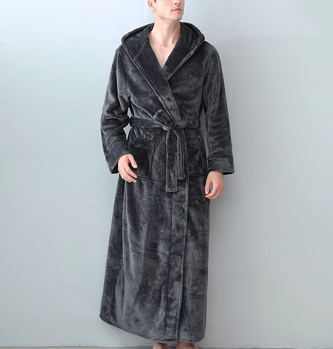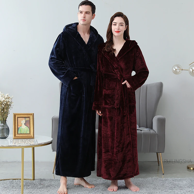Мужской зимний сверхдлинный теплый фланелевый Халат, ярко-Коралловый женский халат с капюшоном и длинным рукавом, банный халат, одежда для сна