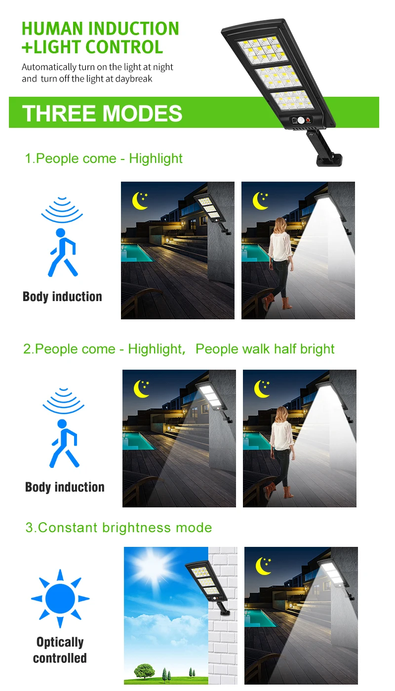 Кнопка РЕЖИМ освещения:-Выключение: режим выключения, индикатор красный;-Первая передача: некоторые люди приближаются, ярко загораются в течение 15-30 секунд, когда ни один не выключается;-Вторая передача: некоторые люди приближаются, ярко светятся в течение 15-30 секунд, и когда их нет, свет всегда яркий и слабый;-Третий механизм: независимо от того, нет ли там кого-то, и слабый свет всегда горит.Время зарядки: 6 часов на солнцеУгол чувствительности PIR: 120 °Расстояние срабатывания: 5 метров