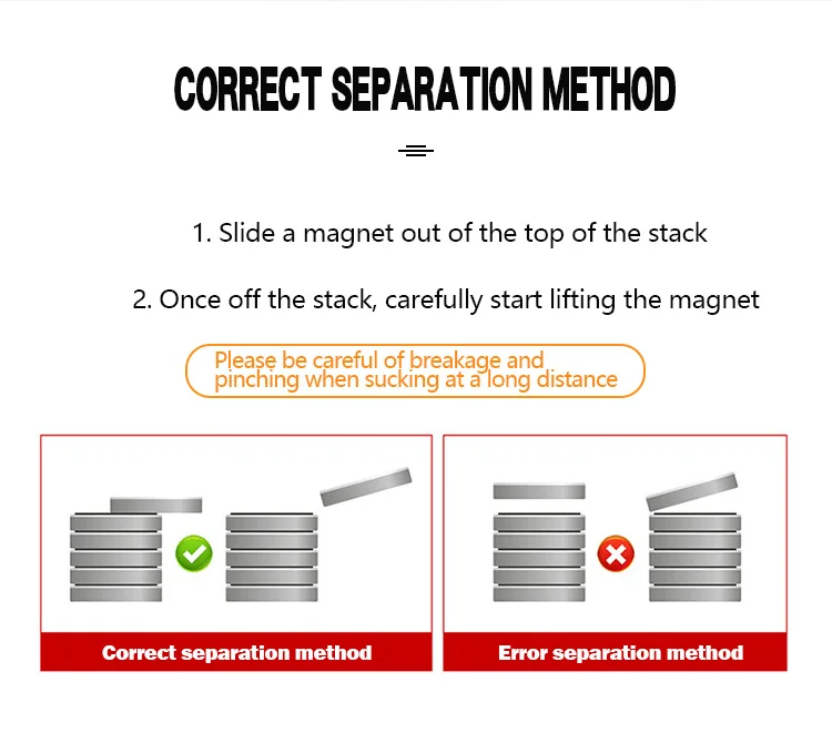 1. Entre un iman fuerte o con otra succión y separación de fase de hierro, el funcionamiento cuidadoso no puede impactar! De lo contrario, es fаcil causar daños o sujetar los dedos;2. Материал El Fuerte magnético Ndfeb es duro, quebradizo y con un fuerte campo magnético. Se debe quitar ligeramente y guardar.3. Фуэрте Иман sugerido que empuja el stagger, no debe palanca dura, de lo contrario es far causar una falta de sangulo;4. Мантенер alejado de la pantalla, tarjeta bancaria, ordenador, TV, teléfono móvil и т. Д.
