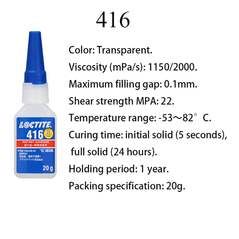Название: 416Спецификация: 20 гЦвет: цвет менее и прозрачныйТип: этилВязкость (МПа/с): 1150/2000Скорость отверждения: 5 секунд начальной отверждения 24 часа полного отвержденияПрочность сдвига: 18/26Относительная плотность: 1,05Используется для пластмасс, заполнения зазоров, эластомеров и металлических зазоров, склеивания грубых и неровных поверхностей, высокой вязкостиБыстросохнущий клей Loctite 401 403 408 406 414 411 415 416 460 495 496 498Как использовать①Для данного товара подходит для склеивания с зазором 0,05 мм, а также предметы должны быть очищен перед склеиванием.②После нанесения клея протрите клей на порт клея, закройте крышку и поместите в прохладное место.Для испарения неизлечимого жидкого клея на соседнюю поверхность может быть нанесен белый остаток. Эта ситуация может быть уменьшена одним или несколькими из следующих способов:①Reduce количество Клей б/у② Скорость потока воздуха на поверхности заготовки③Используйте ускорители для ускорения фиксации Жидких Клеев④Используйте Loctite X-MSTM768 чистящее средство для удаления белых остатковМеры предосторожности1. Этот продукт не подходит для использования в чистом кислороде или богатой кислородом среде и не может использоваться в качестве уплотнительного материала для аммиачного газа или других сильных окислительных веществ.2. Идеальное состояние хранения этого продукта-хранить его в оригинальной посылка в прохладном и сухом месте в диапазоне температур 8 ~ 21 ℃ (46-0F). Идеальная температура хранения неоткрытых цианакрилатных клеев составляет 2 ~ 8 °C (36-46 °F). Для продуктов, хранящихся в холодильнике, они должны быть возвращены к комнатной температуре до открытия и использования.3. Чтобы избежать загрязнения неиспользованного клея, не заливайте клей обратно в оригинальную упаковку.