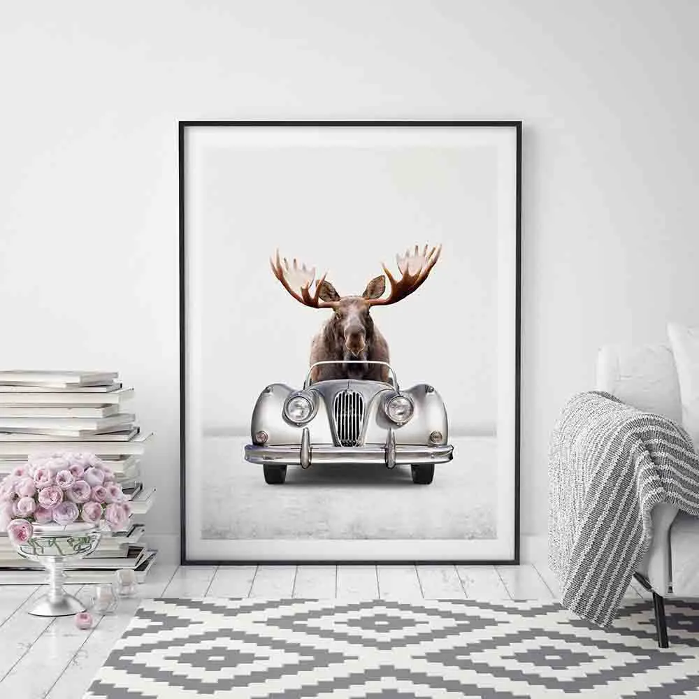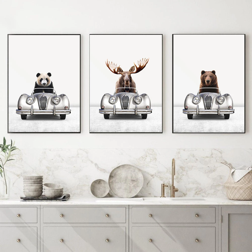 Животные в машине постер для детского сада Печать на холсте забавное настенное искусство Панда медведь лосят Живопись Дети украшения картины b