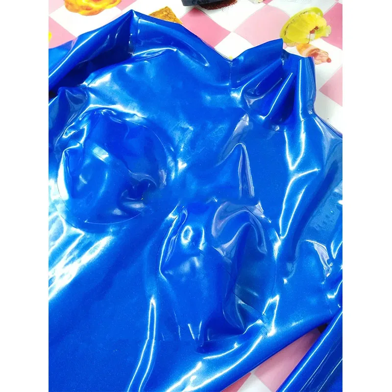 Латексный комбинезон для женщин, металлик, синий, резиновый комбинезон, 3d грудь, молния сзади, черные перчатки, синие носки