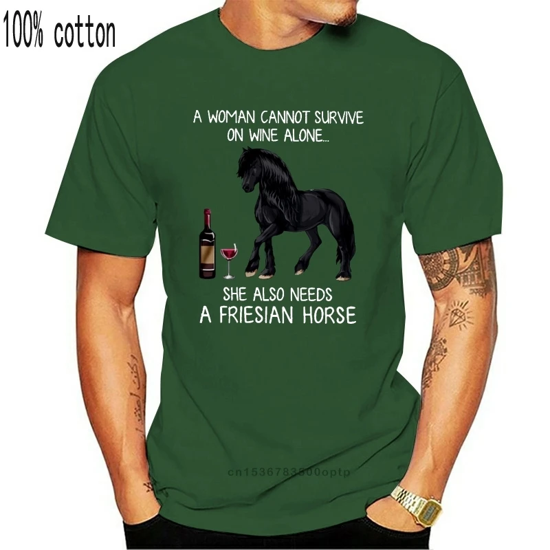 Новая мужская футболка, женщина не может выжить в одиночестве с вином, ей также нужна фризская лошадь, Женская Мужская футболка