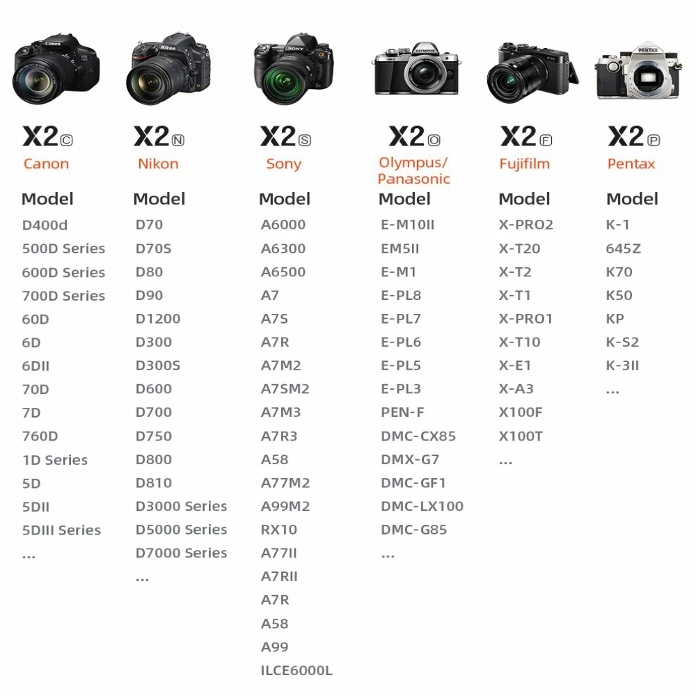 Модель: X2T-CКонкурентоспособные фотокамеры: Canon EOS машина для фотосъемки (E-TTL ttl II), работа с фотоаппаратами для синхронизации ПККонкурентоспособный мобильный телефон:Iphone 6S, Iphone 6s Plus, iphone 7 Plus, iphone 7, iphone 8 Plus, iphone 8,iphone 6,iphone 6 Plus, iphone X;Huawei P9,P10,P10 Plus, P20,P20 pro, Compagno di 9pro, Compagno di 9, compagno di 10pro, Compagno di 10,Samsung: galaxy S8,galaxy Note8,galaxy S9Эта таблица соло elenca i testato modelli di Smartphone, non энергосберегающие смартфоны. Для совместимости с другими моделями смартфонов установлено автоматическое тестирование.