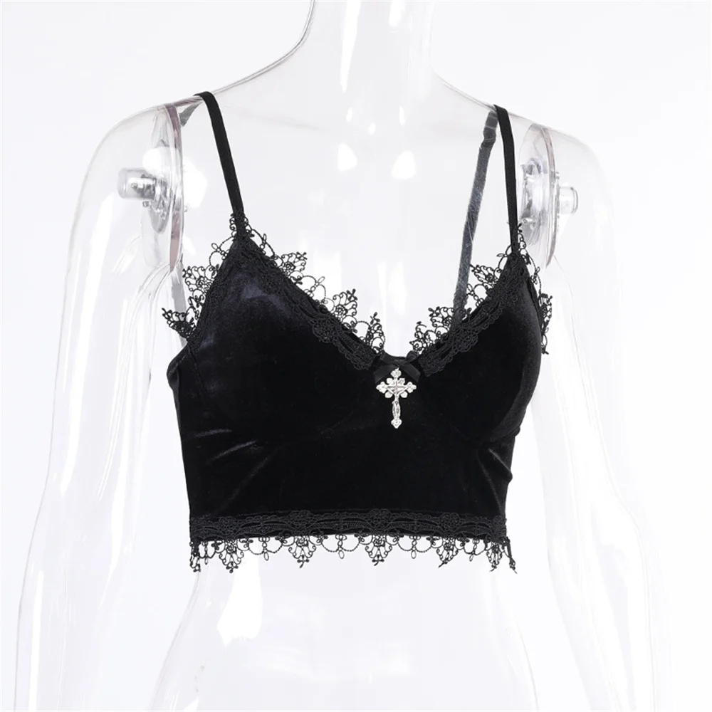 УКОРОЧЕННЫЙ ТОП DAILOU, бархатный, Y2K, готический, черный, с кружевной отделкой, альтернативный эстетический топ с открытой спиной, сексуальные топы на бретелях, в готическом стиле