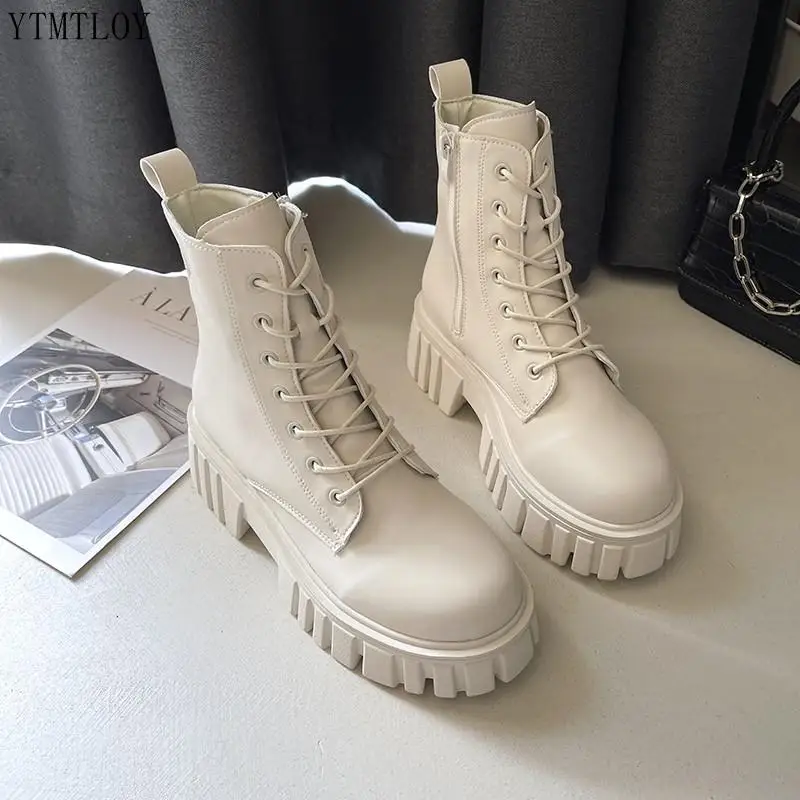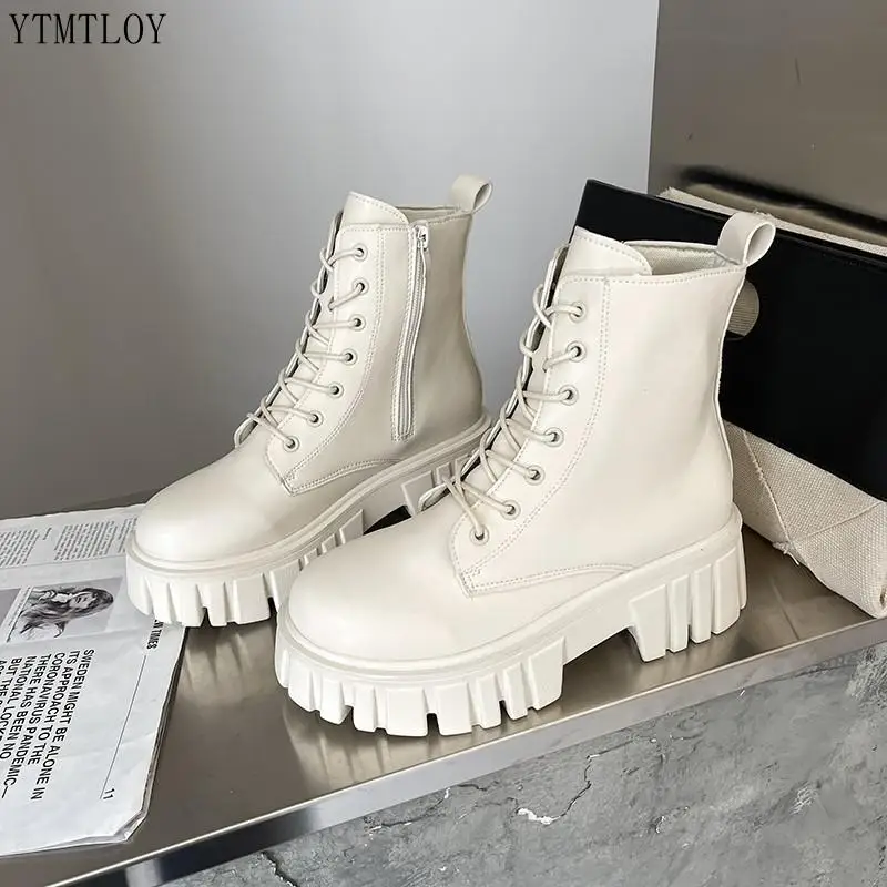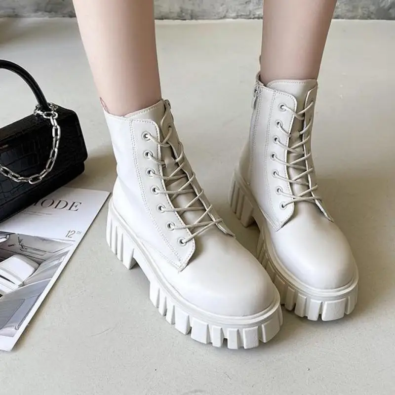 Женские белые ботинки, осенняя модная черная кожаная обувь на платформе 2022, ботильоны в стиле панк, с круглым носком, на квадратном каблуке, женские ботинки