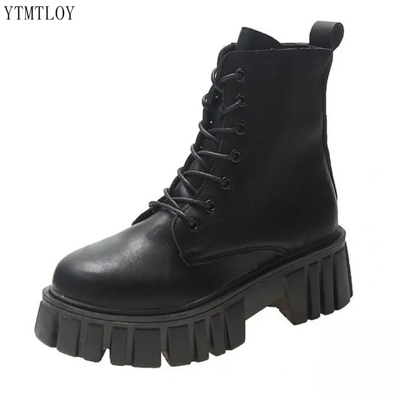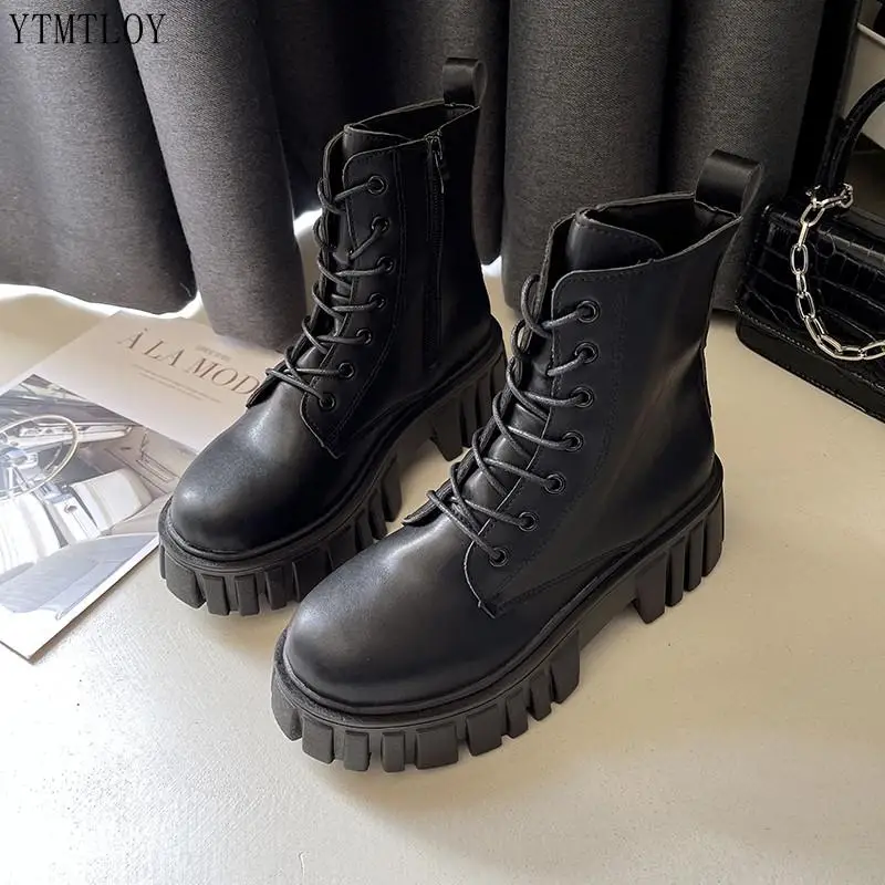 Женские ботильоны на платформе, Черные ботильоны на шнуровке, мотоц...