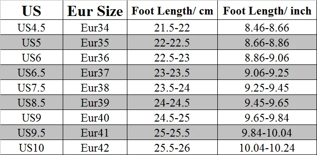 2. Размер основан на длине стопы, Мы предлагаем стандартные размеры и длину стопы EU/CN. Пожалуйста, сверьтесь с подробной таблицей размеров и уточните длину вашей стопы, чтобы подобрать нужный размер. Спасибо!