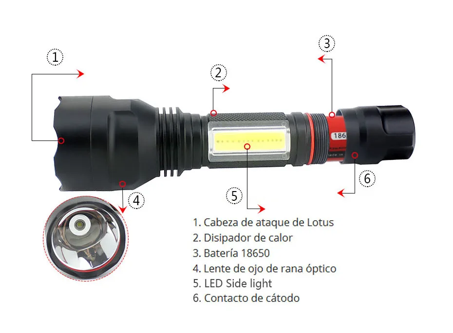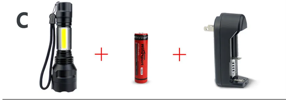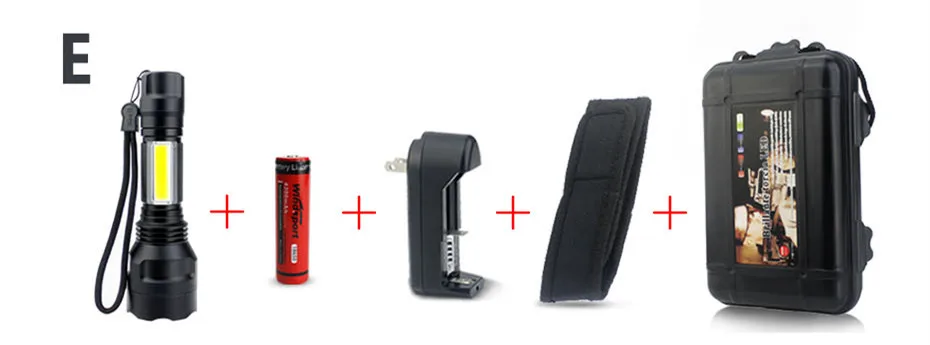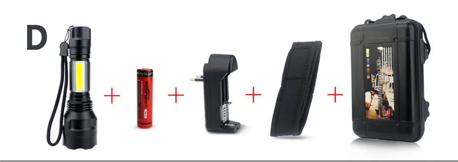 Характеристики: 1. Название модели: C8-COB 2. Светодиодный излучатель: XM-L T6 + COB 3. Режим: 4 режима (верхний свет, нижний свет COB светильник COB свет, мигающий свет) 4. Срок службы лампы: 100000 часов 5. Цвет: черный 6. Излучаемый Цвет: белый светильник 7. Переключатель: Хвостовая крышка Clicky/Clickie 8. Линзы: Плоские линзы 9. Батарея: 1x 18650 батарея 10. Размеры: 14,8 см * 4,5 см * 2,5 см Посылка включает: Посылка A: 1 * фонарик (Не включает зарядное устройство и аккумулятор) Посылка B: 1 * Фонарик 1 * аккумулятор 18650 1 * Зарядное устройство переменного тока (ЕСВилка) Посылка C: 1 * Фонарик 1 * аккумулятор 18650 1 * Зарядное устройство переменного тока (СШАВилка) Посылка D: 1 * Фонарик 1 * аккумулятор 18650 1 * Зарядное устройство переменного тока (ЕСВилка) 1 * нейлоновый чехол для фонарика 1 * Подарочная коробка Посылка E: 1 * Фонарик 1 * аккумулятор 18650 1 * Зарядное устройство переменного тока (СШАВилка) 1 * нейлоновый чехол для фонарика 1 * Подарочная коробка