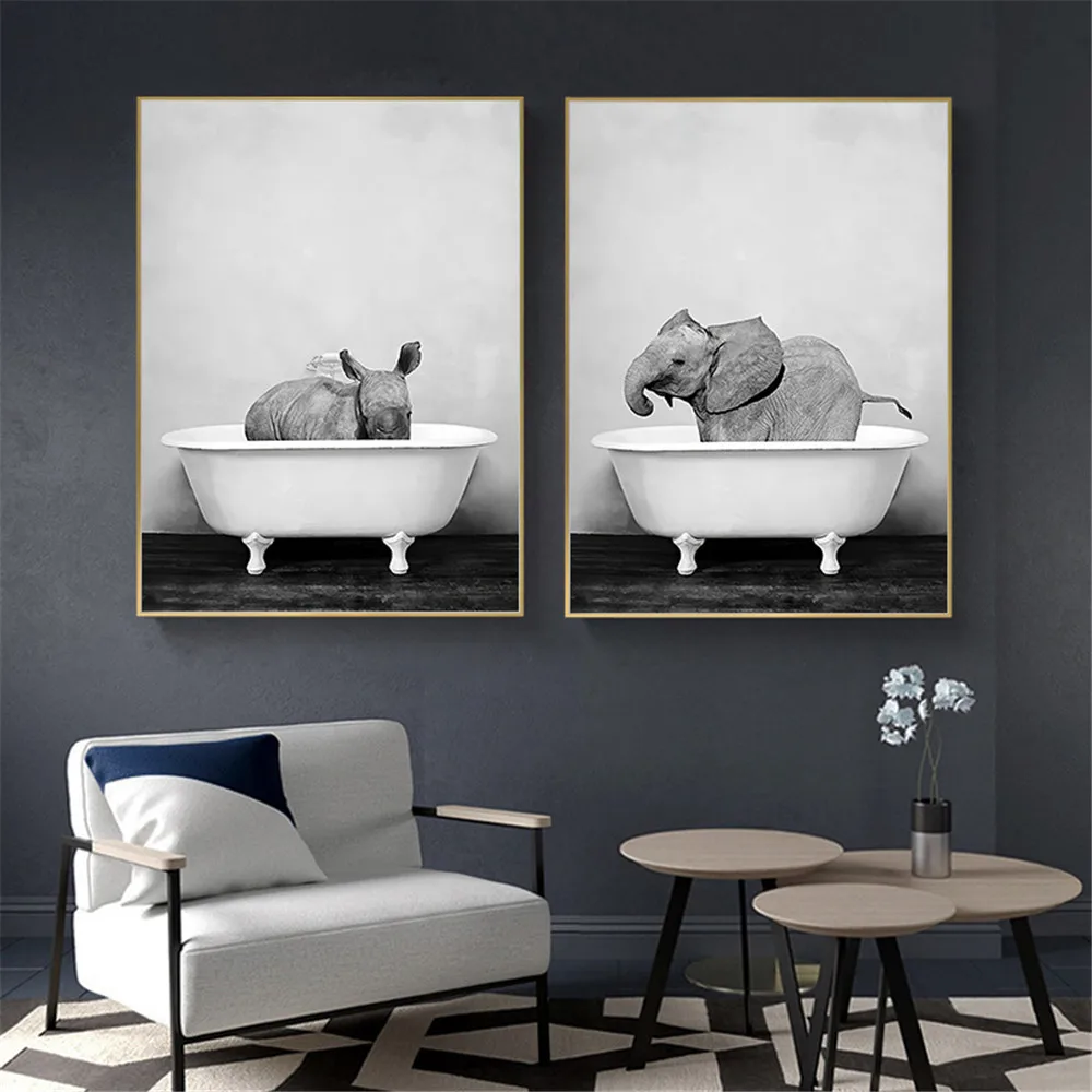 Черно-белая картина для ванны с животными, настенный постер со слоном, львом, пандой, жирафом, печать на холсте, детская комната, ванная комната