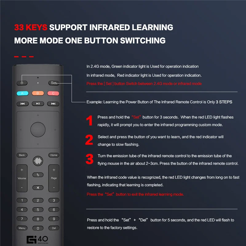 -33 кнопки могут программировать/использовать функцию обучения. И A-B-C кнопки имеют заданный шаблон Funtion.