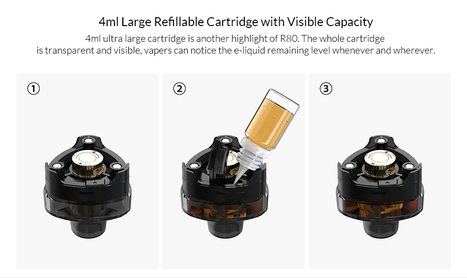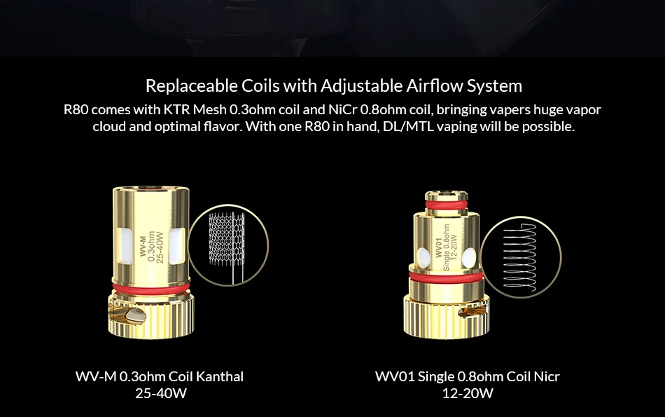 Картридж R80 специально разработан для совместимости с модом WISMEC R80 pod. Благодаря совершенно новым сменным WV катушкам с регулируемой системой воздушного потока, огромное облако пара и оптимальный вкус будут легко получить. Упакованный с видимым картриджем 4 мл и удобной нижней системой наполнения электронных жидкостей, R80 обязательно принесет вам восхитительный опыт вейпинга.