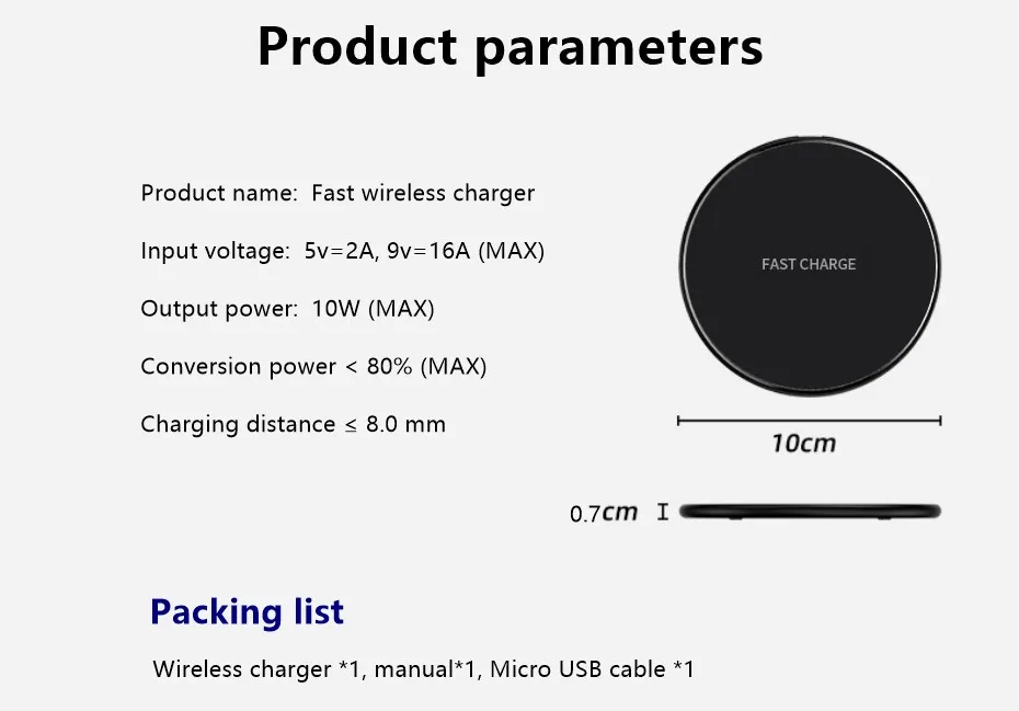 Примечание:1. Принимаем дропшиппинг, и мы не будем размещать никаких счетов-фактур, qr-кодов, рекламных акций или логотипов бренда в отгрузке, поэтому не волнуйтесь, просто купите его, мы сделаем все для вас хорошо.2. Мы гарантируем, что каждое устройство тщательно проверяется перед отправкой, поэтому все продукты KEPHE могут гарантировать 100% Высокое качество перед отправкой, если нет, возврат денег! Поэтому не беспокойтесь о качестве. Самая низкая цена, высокое качество! Закажите скоро!Характеристика:Особенности:Быстрая Беспроводная зарядка: режим быстрой зарядки 10 Вт совместим только с Samsung Galaxy S9/S9 Plus/S8/S8 Plus/Note 9/Note 8/Note 5/S6 Edge/S7/S7 Edge и другие продукты серии Galaxy Note и Galaxy S, 7,5 Вт Быстрая зарядка совместима с iPhone X/XS MAX/XR, iPhone8/8 plus (Другие устройства с поддержкой Qi будут заряжаться со стандартной скоростью беспроводной зарядки). Многофункциональная Защита: дизайн в будущем делает его ультра тонким, без раздражающих звуков, без запаха пластика, даже светодиодный индикатор является низким и не вызывает никаких помех в ночное время. Противоскользящее резиновое основание предотвращает скольжение устройства во время зарядки. Металлический корпус из алюминиевого сплава: металлический корпус создает прочную, прочную беспроводную подставку для зарядного устройства, и он может эффективно снизить температуру, защищает ваши телефоны от перегрева. Расслабьтесь, зная, что ваш телефон безопасно заряжается у вашей кровати. Характеристики:Цвет: черный/серый/синий/красныйВход: 10 ВтВыход: 5 Вт/7,5 Вт/10 Вт/15 Вт/20 ВтЭффективность зарядки: >75%Частота зарядки: 110 - 205 кГц Посылка включает в себя:1 * Быстрое беспроводное зарядное устройство1 * USB кабель