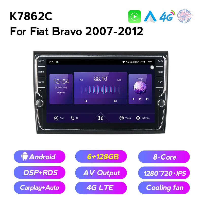 Автомобильный мультимедийный плеер 2 Din, 1280*720, Android 11, IPS, DSP, радио, GPS, для Fiat Bravo 2007-2011, 2012, 6G + 128G, навигация, стерео