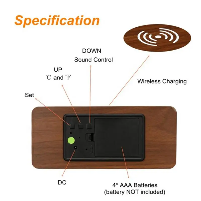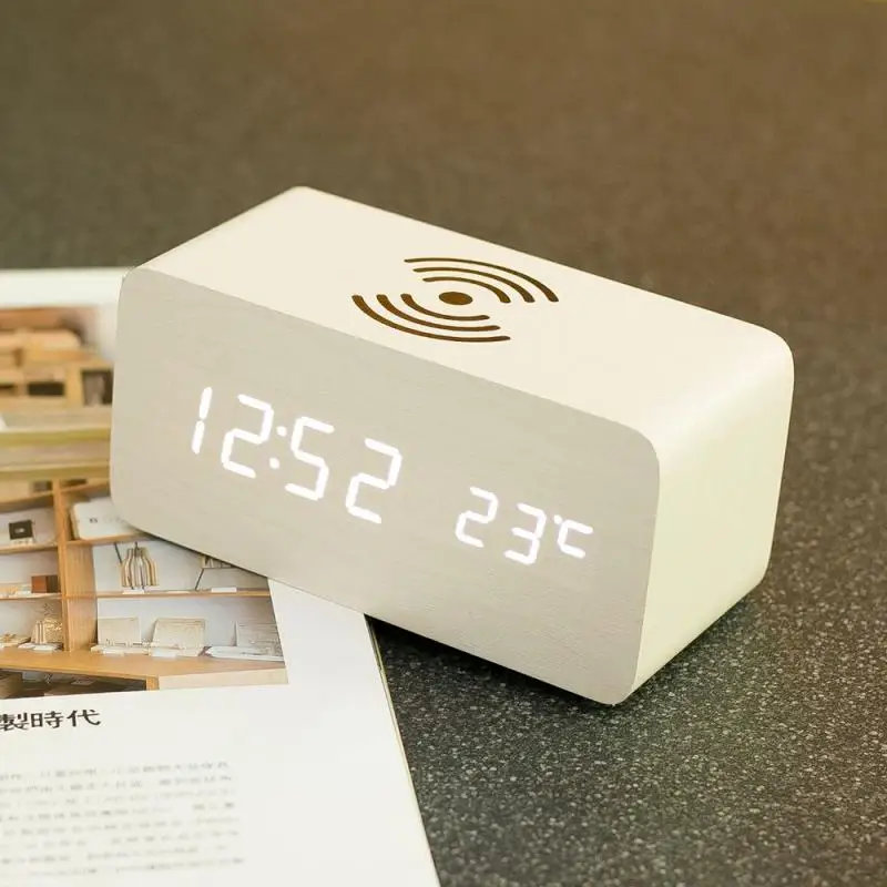 Будильник с беспроводной зарядной подставкой Qi, совместим с Iphone, Samsung, деревянные светодиодные цифровые часы с функцией управления звуком,