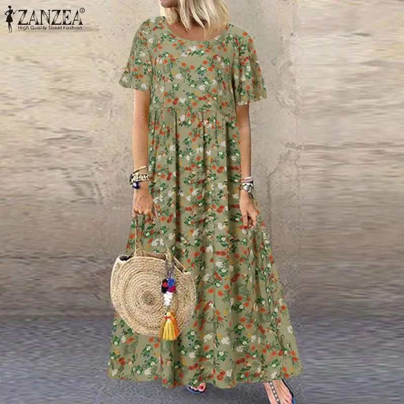 Платье ZANZEA женское в богемном стиле с цветочным принтом, длинный сарафан с коротким рукавом, винтажный Свободный Повседневный Пляжный наряд большого размера, 7, лето 2022