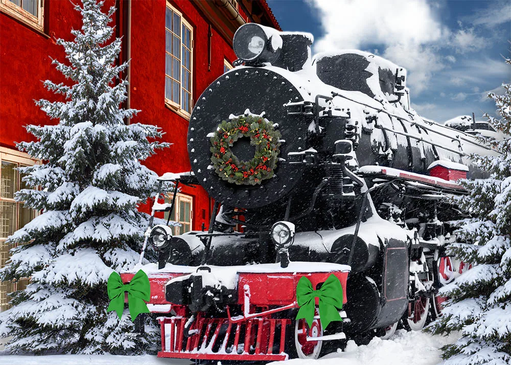 Зимний праздник Экспресс фон Замороженные Рождественские елки снег день рождения художественный фон фотостудия Поезд Красный дом Рождественские реквизиты