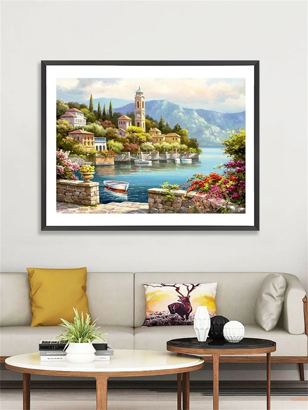Бриллиантовая живопись пейзаж с виллой DIY 5D, полноформатная Кругл...