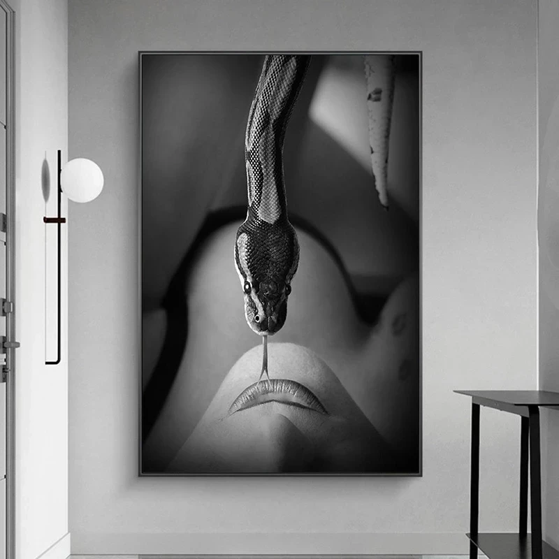 Холст с изображением девушки и змеи, черно-белая Настенная картина, сексуальные женские плакаты и принты, современные картины для декора гостиной
