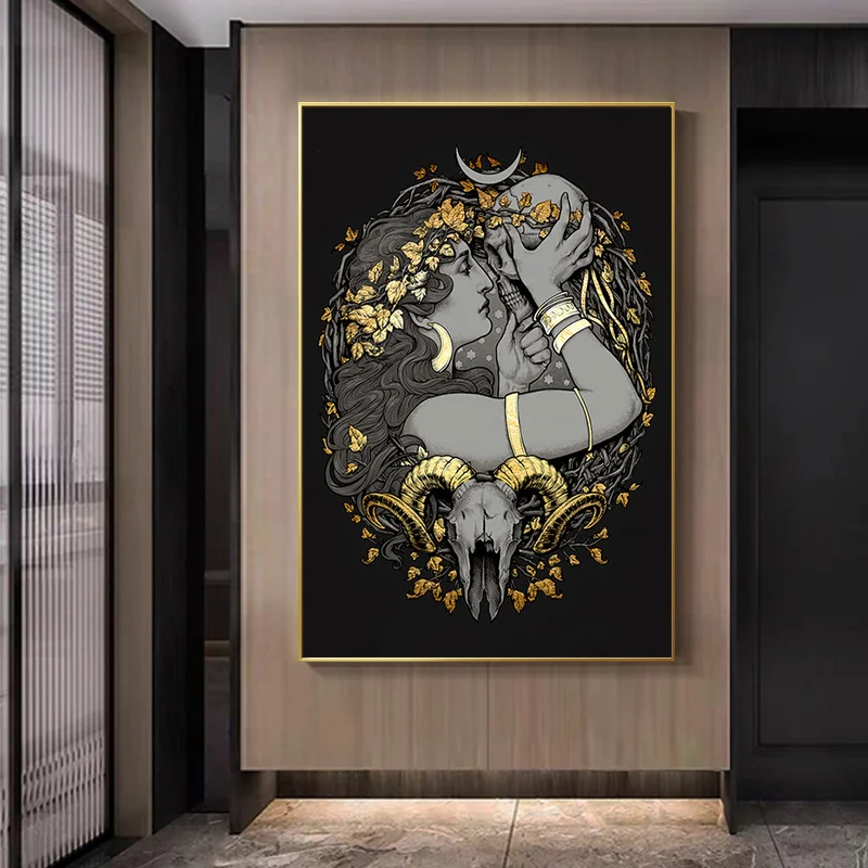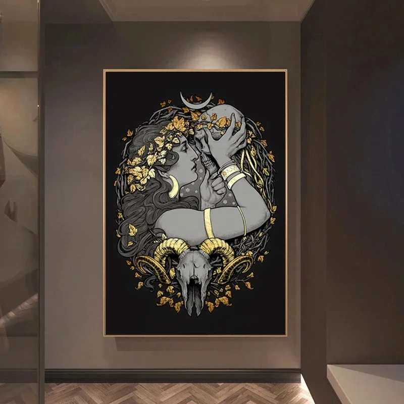Готическая богиня, череп, лоза, холст, живопись, мифологическая фигурка, плакаты, принты, черные и золотые картины для украшения гостиной