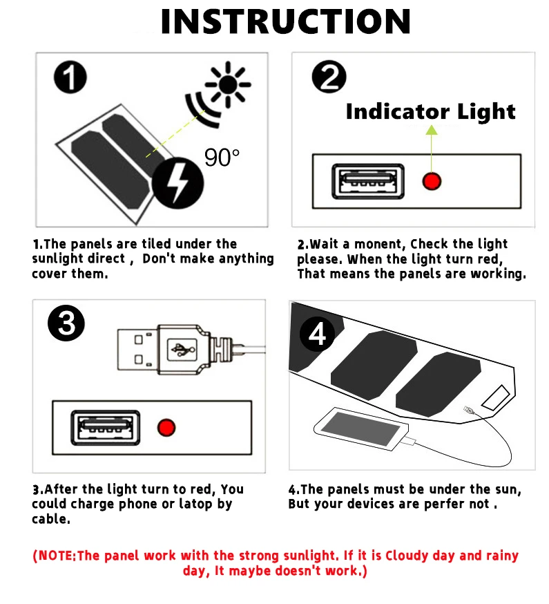 1. Панели выложены под прямым солнечным светом, не закрывайте их.2. Подождите месяц, проверьте светильник, пожалуйста. Когда светильник станет красным, это означает, что панели работают.3. После того, как светильник станет красным, вы можете зарядить телефон или latop кабелем.4. Панели должны быть под солнцем, но ваши устройства превосходны.