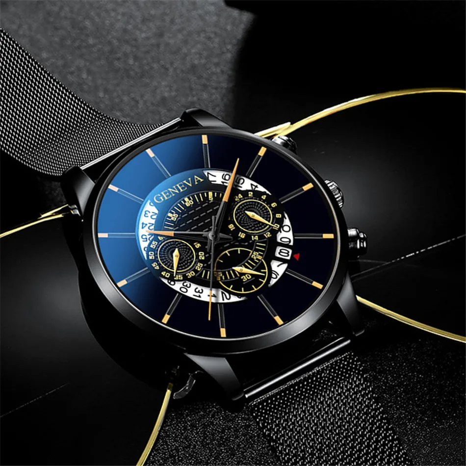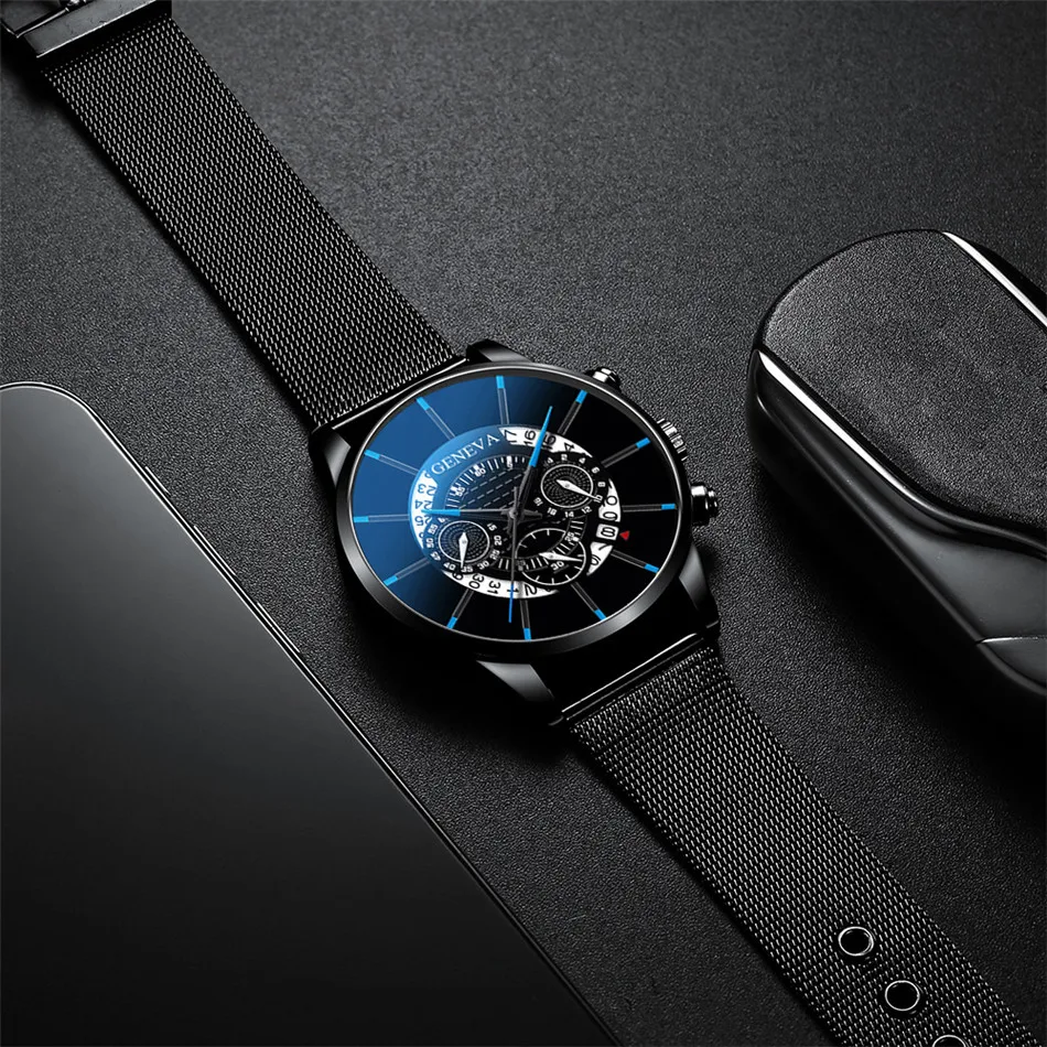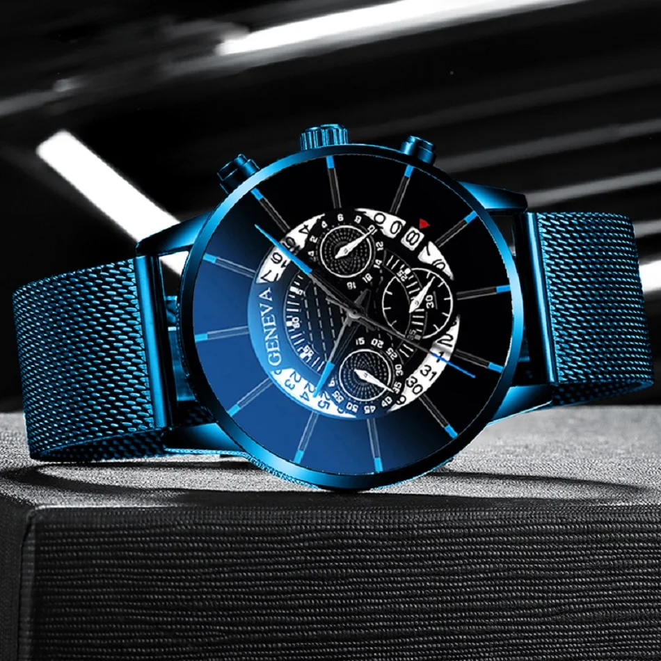 Часы мужские, с сетчатым ремешком из нержавеющей стали, синие, с календарем