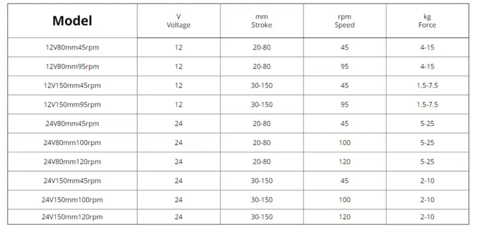 Посылка:Версия провода посылка входит:1) поршневой механизм 1 шт.,2) мотор-редуктор постоянного тока 1 шт.,3) адаптер питания с регулировкой скорости 1 шт.4) разъем 3XLRНапряжение: 12 В/24 ВМощность: 15 ВтКрутящий момент: 12 в 1 5 кг/см; 24 в 20 кг/смСкорость: 45/95/100/120 об/мин ± 10%Выходной диаметр: H1-6 мм (M6) ,H2 и H3-8 мм (M8)Ход этого продукта можно регулировать в соответствии с потребностями пользователя.Скорость линейного движения может быть достигнута, регулируя напряжение двигателя. Мы предоставляем адаптер питания.Примечание: Пожалуйста, выберите модель в соответствии с требуемой скоростью. Номинальная скорость-это скорость, при которой эффективность является максимальной, а тяга-максимальной. Снижение скорости через регулирование скорости обычно приводит к падению тяги.Описание двигателя:Например, 24V150mm120rpmH3, напряжение 24В, ход 150 мм, скорость 120 об/мин. Модель H3 is;Примечание: толкающее усилие питается от двигателя, ход можно регулировать в пределах номинального диапазона,Чем меньше ход, тем больше тяга,Чем больше ход, тем меньше тяга.