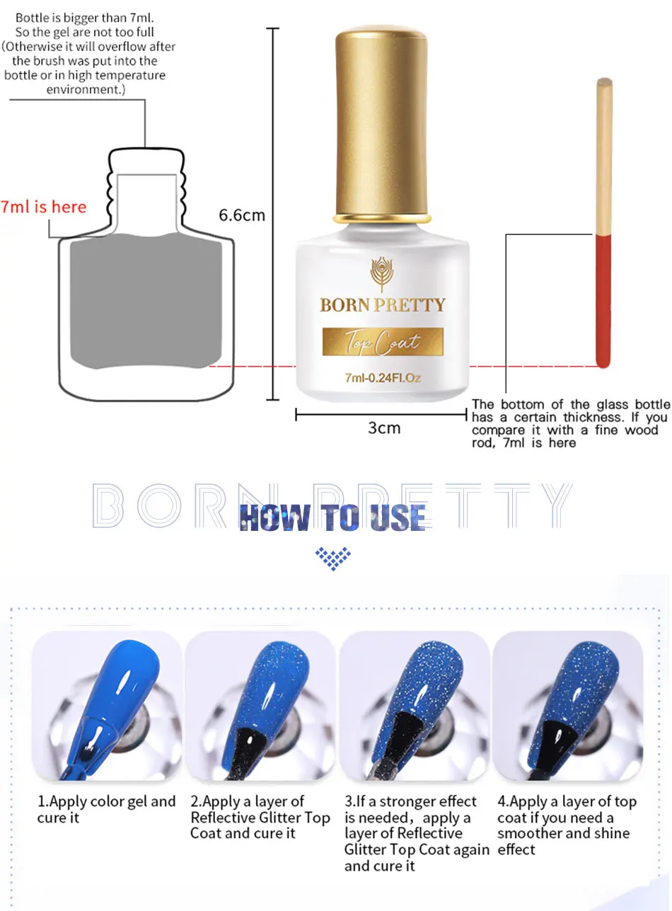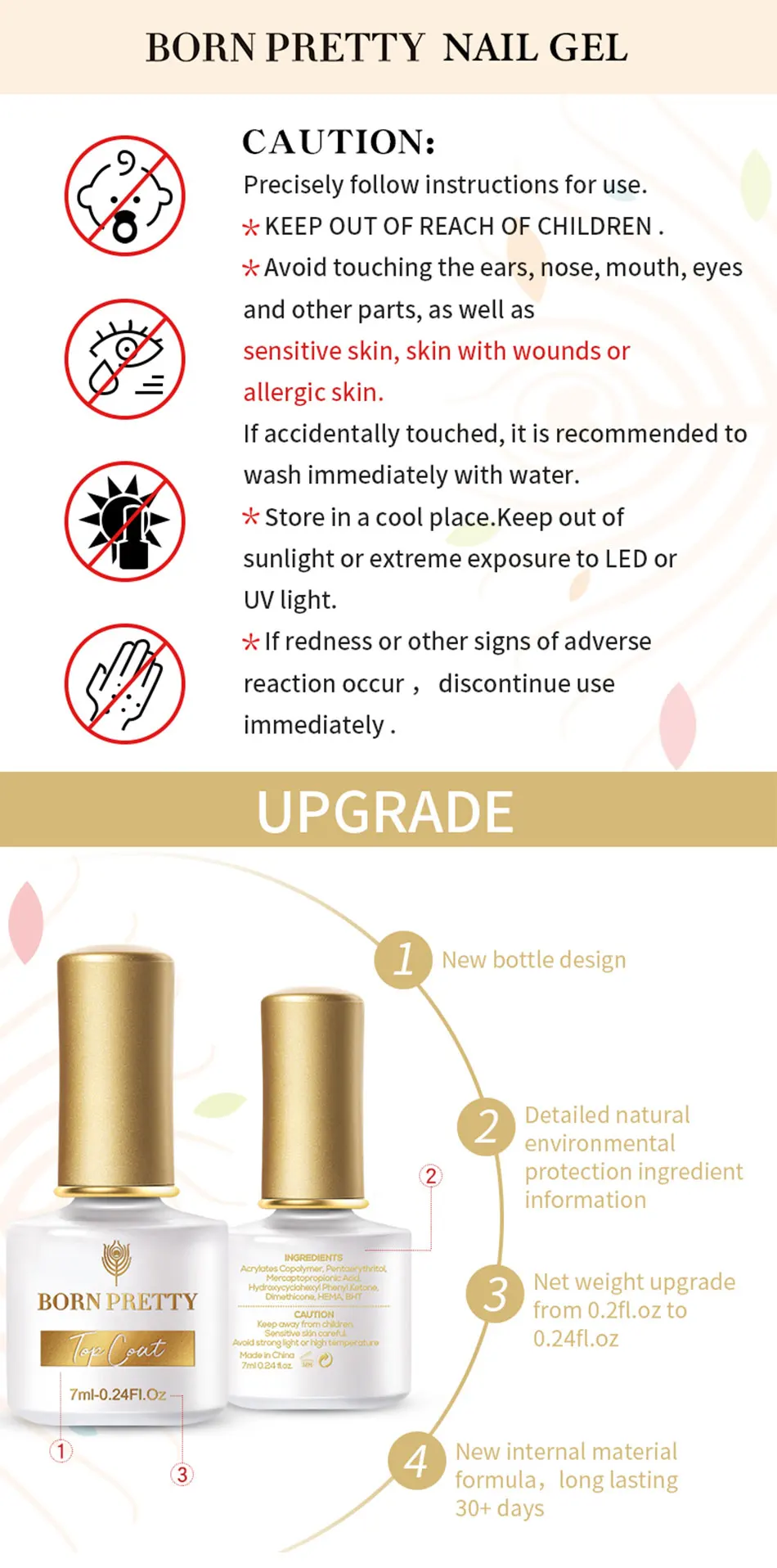 Спецификация:Бренд: BORN PRETTYТип: Гель-лакКоличество: 1 флаконЕмкость: 7 млДлительный период: около 30-45 днейПодходящая лампа: УФ-лампа или Светодиодная лампаКомплектация:Функциональный гель для бутылки BORN PRETTY 1Особенности:Он изготовлен из здоровых, экологически чистых, экологически чистых, не ядовитых, резких химических материалов.Быстро сохнет с любым УФ-светом.Длительный срок службы не менее 30-45 дней, фантастические и супер блестящие ногти для вас.Этот Гель-лак для ногтей легко наносится и отмачивается.Позвольте вам для профессионального или домашнего дизайна ногтей.Профессиональный подарок для ногтей для себя или вашей девушки.Профессиональный использование:Шаг 1. Очистите ногти, затем обрежьте поверхность ногтей, как обычный процесс маникюра.Шаг 2. Полностью встряхните Гель-лак, он может сделать цвет гель-лака сбалансированным. (ВАЖНО)Шаг 3. Сначала нанесите базовый гель, который может сделать лак длительным дольше, вылечите УФ-лампой или светодиодной лампой. (Необходимо)Шаг 4. Нанесите первый слой цветного геля непосредственно, вылечите УФ-лампой в течение 2 минут или вылечите светодиодной лампой в течение 60 секунд.Шаг 5. Нанесите второй слой цветного геля, а затем немедленно вылечите УФ-лампой в течение 2 минут или вылечите светодиодной лампой в течение 60 секунд.Шаг 6. Пальто со светоотражающим блестящим верхним покрытием, вылеченное УФ-лампой или светодиодной лампой.Удалить УФ Гель-лак для ногтей шаг:• Замочите ногти в стеклянной миске, наполненной небольшим количеством ацетона, или оберните каждый ноготь в ватный тампон, пропитанный ацетоном, примерно на 5-10 минут.• Продукт начнет размягчаться, и вы можете аккуратно снять его пилкой или спродвинуть с помощью небольшой деревянной палочки.Важное примечание:1. Примечание: Избегайте контакта с кожей. В случае аварии или если вы чувствуете себя нездоровым, немедленно обратитесь за медицинской консультацией. (покажите этикетку, когда это возможно)2. Сохраняет герметичность. Беречь от солнечного света. Хранить в недоступном для детей месте.