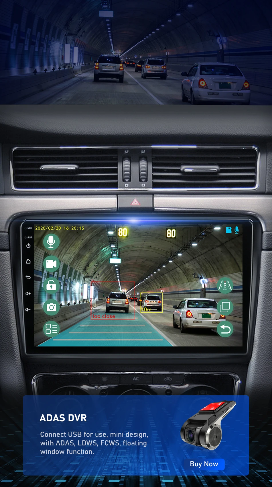 Поддерживает подключение к видеорегистраторУ ADAS. ADAS DVR имеет несколько встроенных ассистивных технологий вождения, вставляя высококачественную карту памяти TF для записи каждого момента вашего вождения.