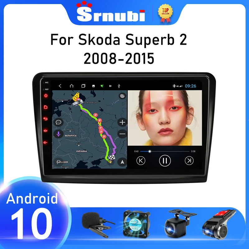 Автомагнитола Srnubi на Android 10 для Skoda Superb 2 2008-2015 с радио, мультимедийным видеоплеером и GPS-навигацией, 2 din, IPS, DVD