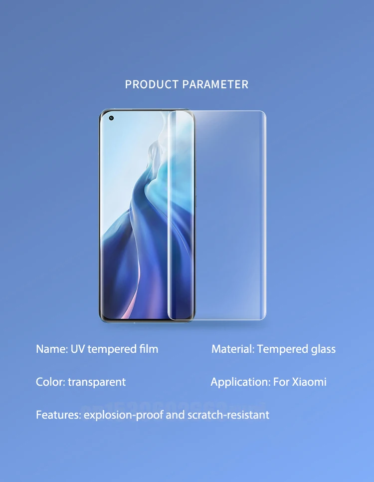 Мы рекомендуем купить не менее 2 штук, чтобы вы могли получить дополнительную скидку 5% и использовать в качестве запасного.Особенности и характеристики:-Новое УФ закаленное стекло обеспечивает высокую степень защиты вашего экрана.-Гидрофобное и олеофобное покрытие может предотвратить окрашивание вашего телефона масляными пятнами, отпечатками пальцев и другими пятнами.-Ультратонкий и прозрачный дизайн для обеспечения высокой четкости просмотра.-Высокая чувствительность и отклик, как и оригинальный экран-Царапины на экране восстановятся естественным образом, чем тоньше, тем быстрее-Значительно повышает прочность экрана, поэтому вам не придется беспокоиться о том, что экран будет хрупким-УФ закаленное стекло в настоящее время является наиболее подходящим защитным стеклом для изогнутых экранов на рынке.Руководство по установке:Мы предоставим вам видео для объяснения установки. Новое закаленное стекло UV не требует каких-либо дополнительных инструментов, и процесс установки простСписок товаров:1 х Xiaomi UV Новое закаленное стекло1 x чистящий набор1 УФ-лампа1 УФ-клей