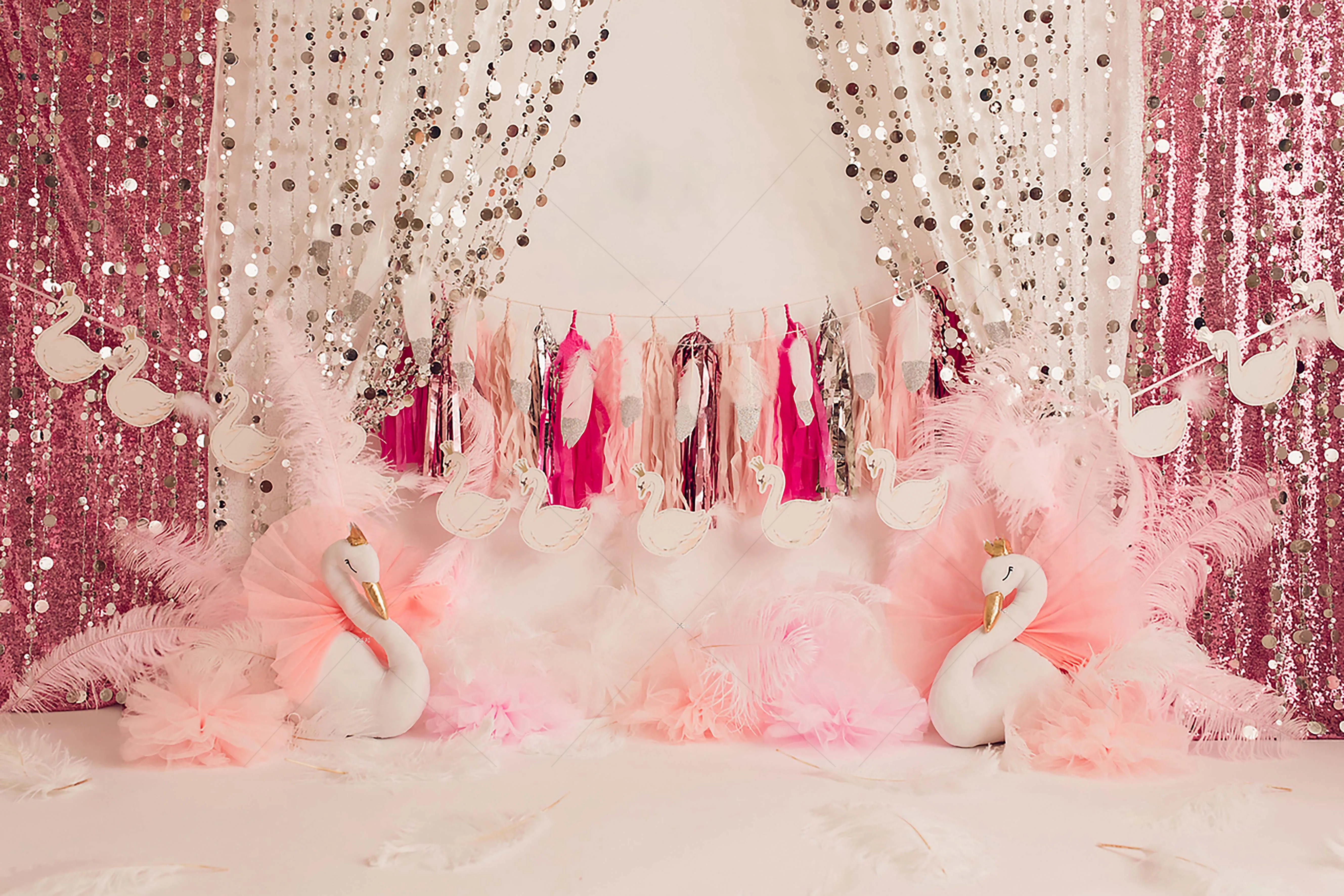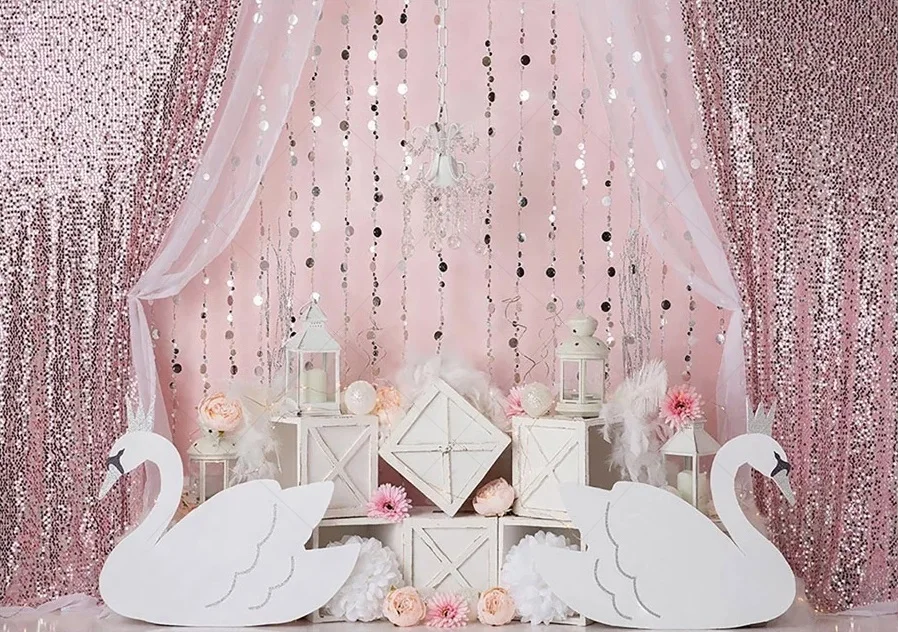 Фон для фотосъемки с изображением белого лебедя принцессы пера цветов розовой занавески Фотофон для дня рождения девочки