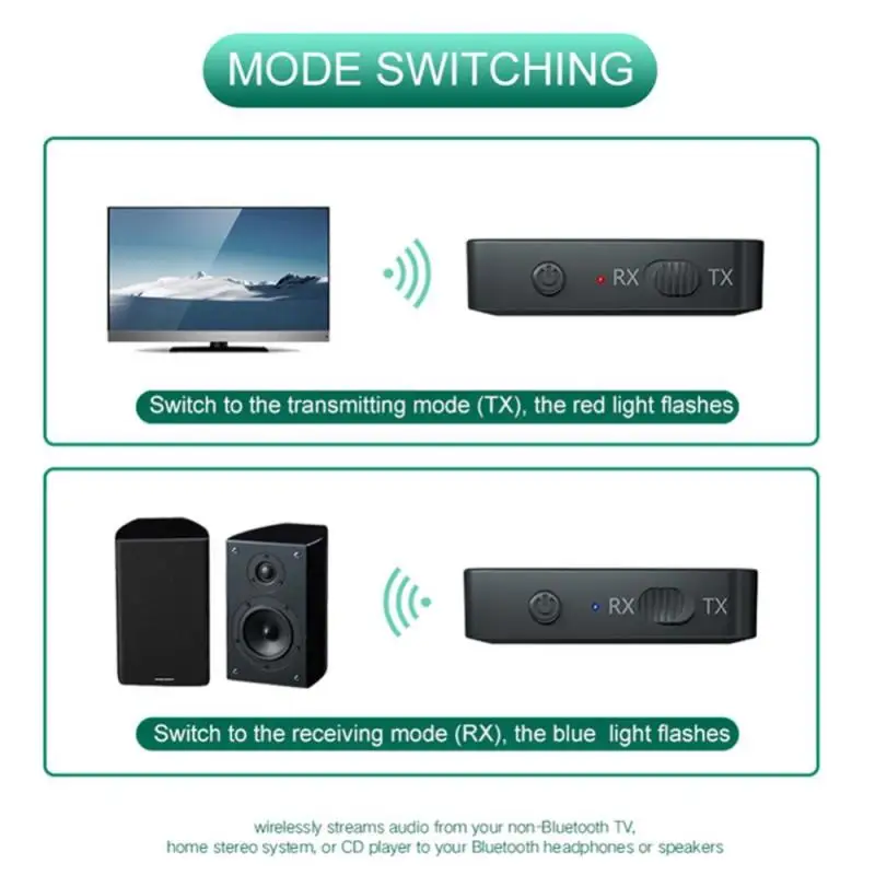 2. Режим передатчика: Беспроводная передача аудио с вашего телевизора без Bluetooth, домашней стереосистемы или CD-плеера на наушники или колонки Bluetooth. Режим приемника: Беспроводная передача аудио с телефона, планшета или компьютера с поддержкой Bluetooth на проводную стереосистему, динамики или наушники.