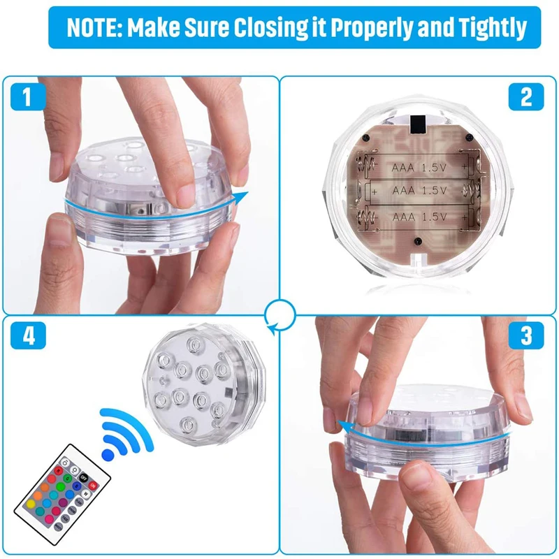 * Перед тем, как бросить в воду, убедитесь, что завинтите крышку по часовой стрелке правильно и плотно.* Когда батарея разряжается, индикаторы застревают красным цветом, если больше не переключаются между цветами и пульт дистанционного управления перестает работать, замените батарею.* Максимальная глубина для достижения рекомендуется составлять менее 2 м.