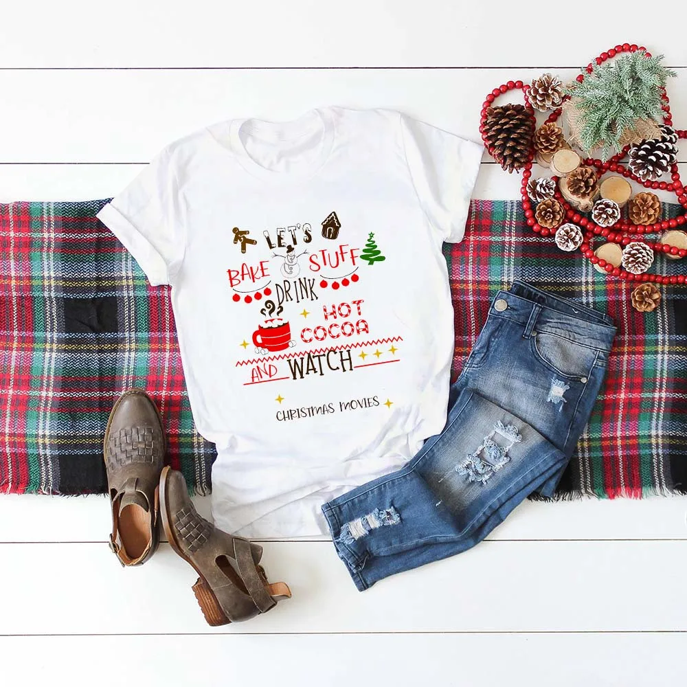 Женская футболка с рисунком, милый эстетический Топ, футболка с надписью Let Bake Stuff Drink Hot Cocoa and Watch, Рождественская футболка из фильма