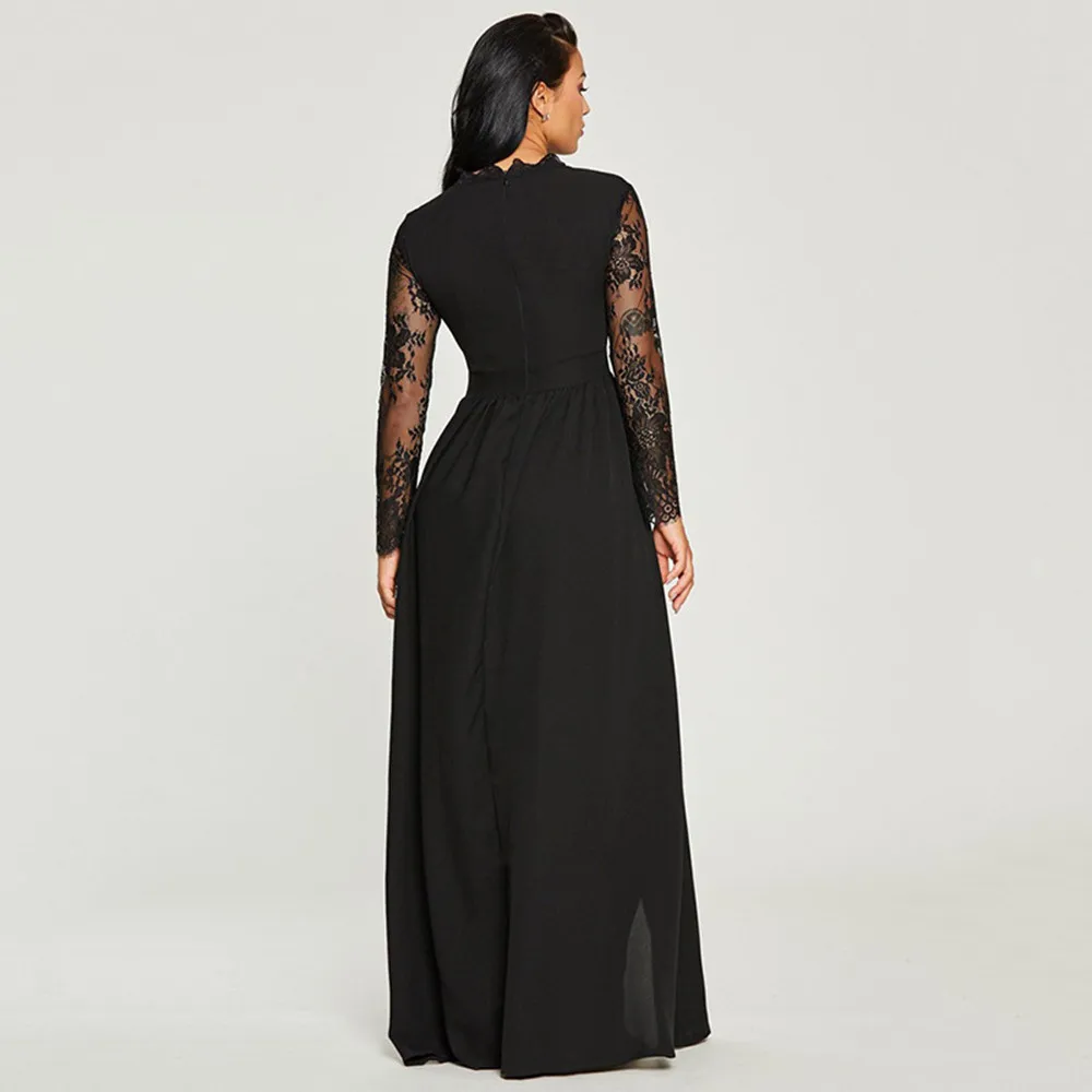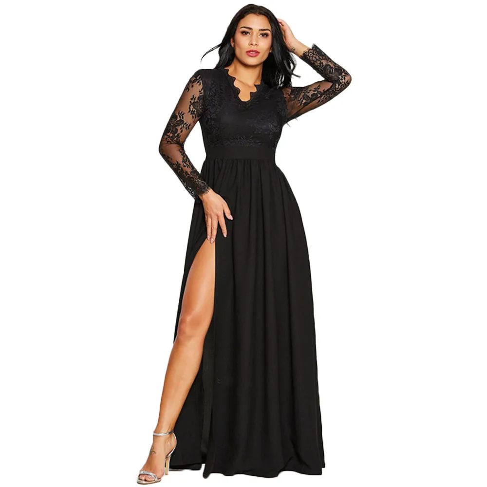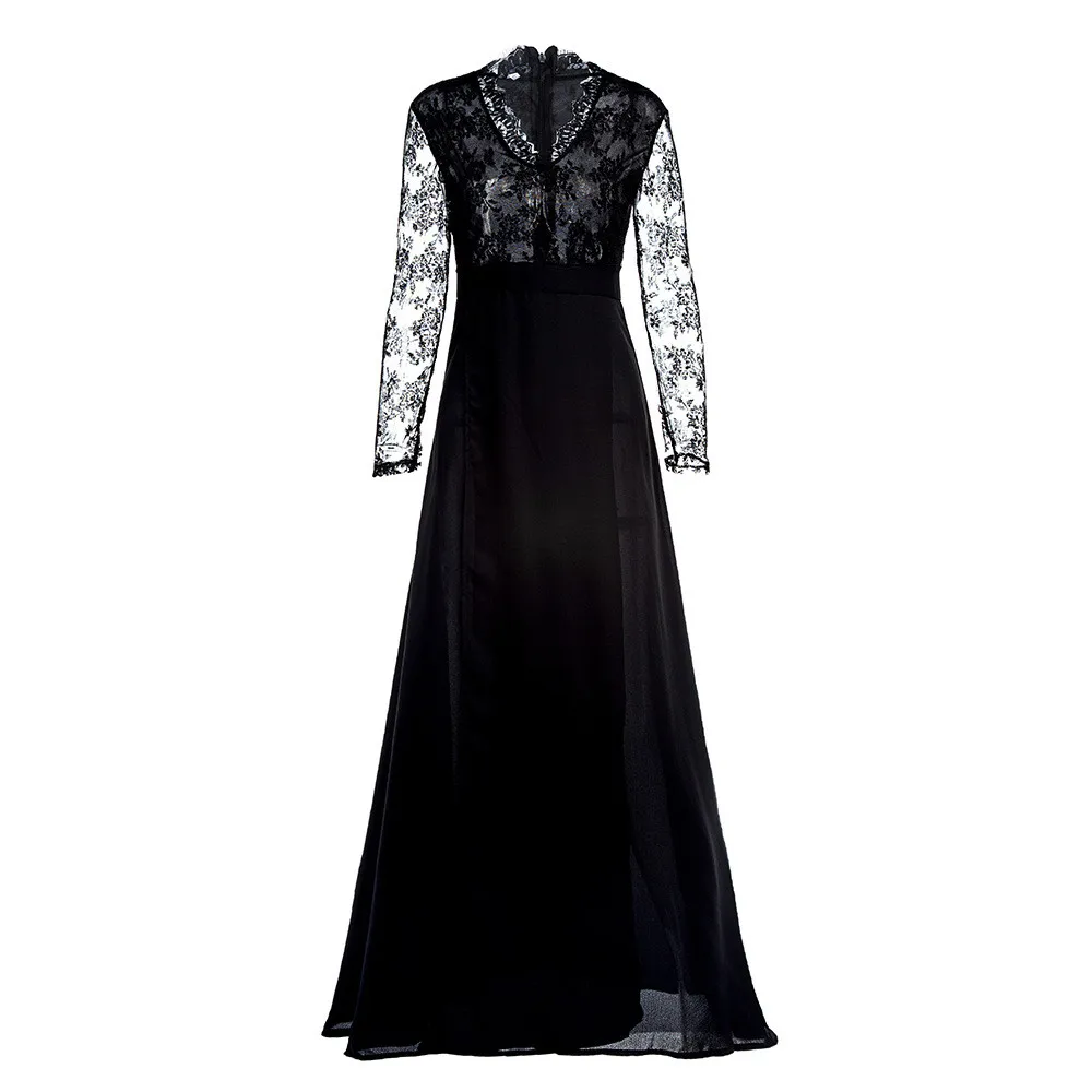 Женское кружевное длинное платье с глубоким V-образным вырезом и длинным рукавом